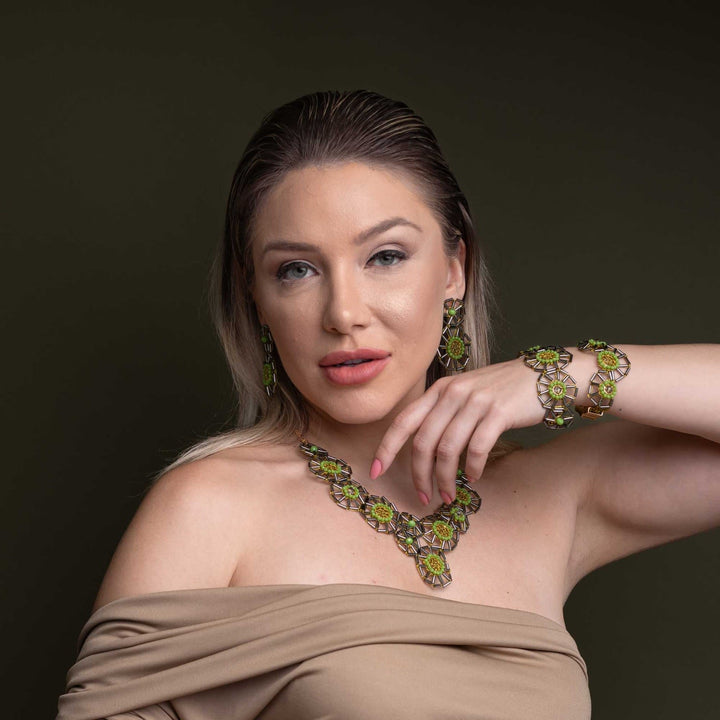 This Neon Green Mix Themis Handmade Crochet Bracelet by Lavish by Tricia Milaneze is a striking geometric cuff that blends bold colour with meticulous craftsmanship. Brazilian artisans crochet shimmering enameled wire into intricate open patterns, embellished with sparkling crystals and beads for a vibrant finish. Lightweight and versatile, it adds confidence and individuality to any look while remaining comfortable for daily wear. The magnetic clasp ensures effortless fastening, making it both practical and stylish.