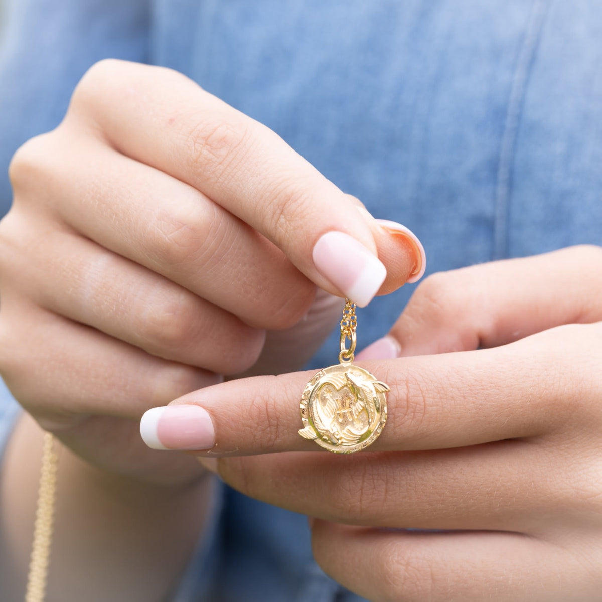 Crafted from 100% recycled 925 sterling silver with 18ct gold plating. Pisces zodiac pendant with koi fish detailing.