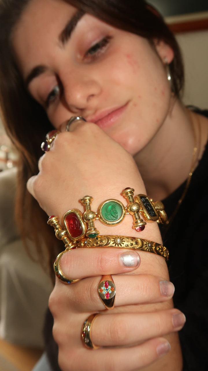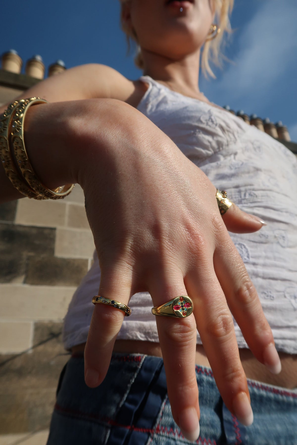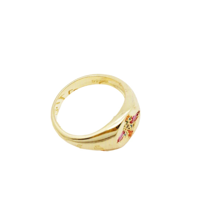 This Ruby's Signet Ring by Recreation Jewels is an elegant and timeless piece that features a vibrant array of multi-colored gemstones, making it a perfect accessory for any occasion. Its classic signet design is elevated by a modern touch of color, ensuring it stands out while remaining sophisticated. Crafted to be water-resistant and hypoallergenic, this ring offers a blend of style, durability, and comfort, perfect for everyday wear and sensitive skin. It embodies a refined and joyful aesthetic.