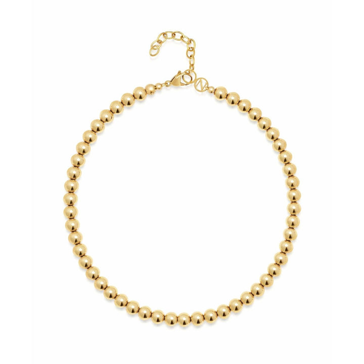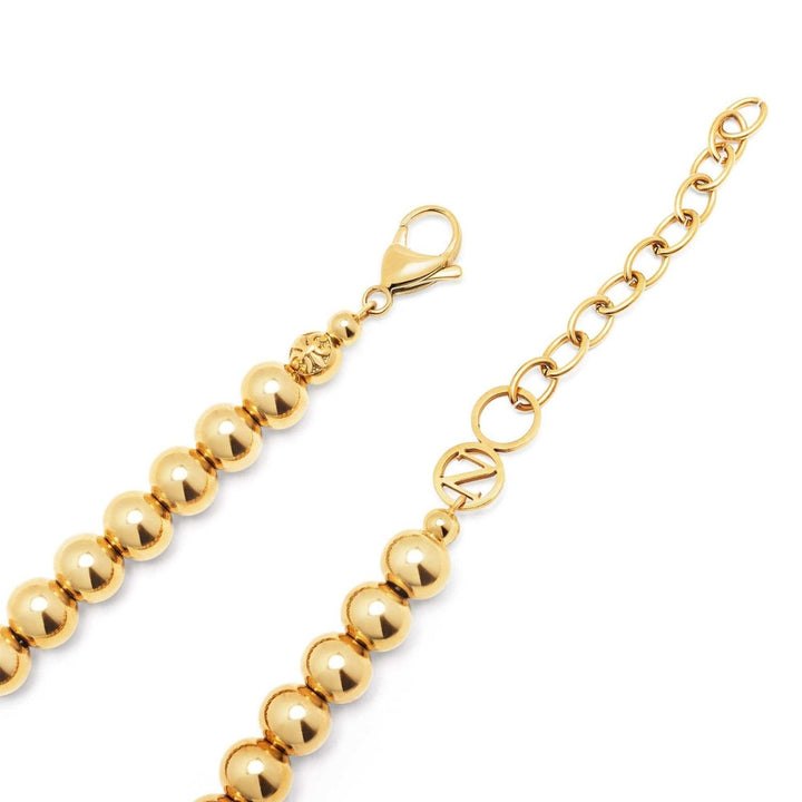 This choker is crafted from durable 316L stainless steel with 18k gold plating and features radiant gold-plated beads. It is water, heat, and sweat-resistant, and hypoallergenic.