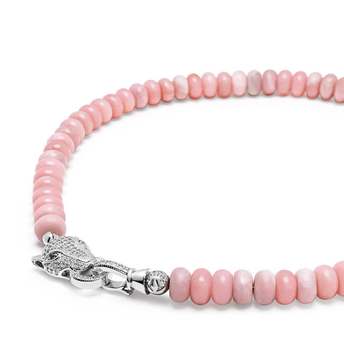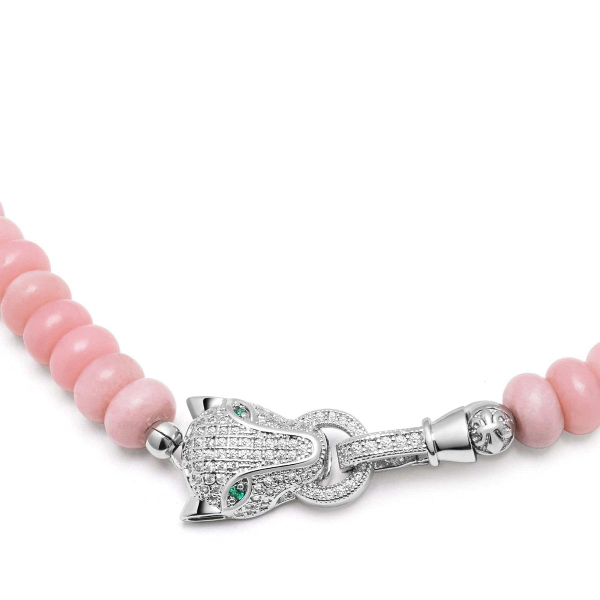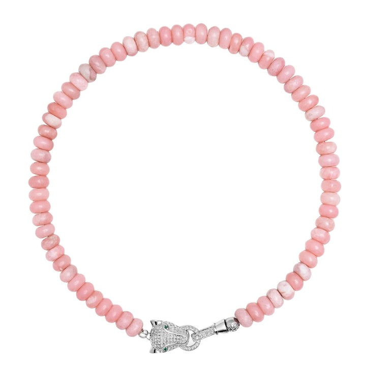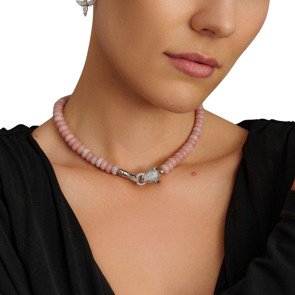 This choker is hand-strung with smooth 8mm pink opal beads. It features a cubic zirconia-adorned panther head.