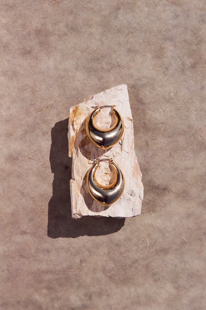 These hoops are made from 14k gold-filled material, which consists of high-quality outer layers of solid gold bonded with other inner metals. They are water-resistant and hypoallergenic.