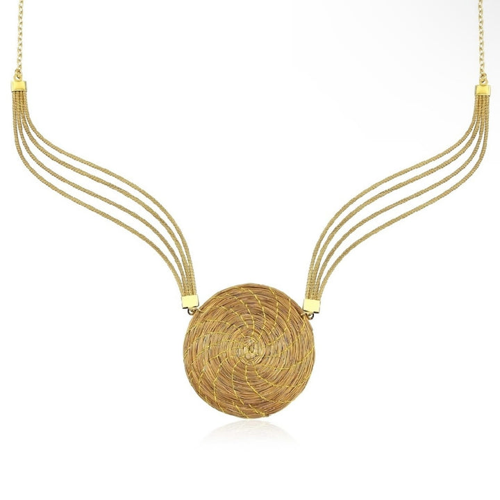 Handwoven golden grass combined with 18k gold-plated recycled brass and golden nylon thread. Nickel-free and hypoallergenic. Each piece is handcrafted without pesticides, chemicals, or toxins.