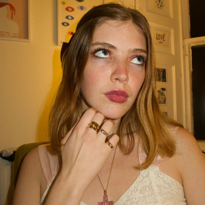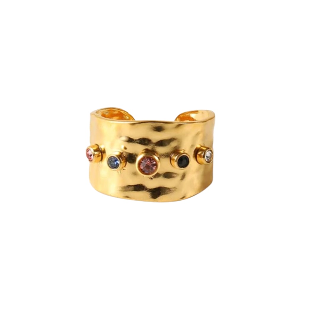 This Ophelia’s Ring by Recreation Jewels is a precious and eye-catching accessory that radiates vibrant personality. Featuring a stunning array of pink, blue, clear, and green cubic zirconia stones, this ring is a colorful celebration of life and style. Its adjustable design makes it a versatile piece that will make a perfect fit and is a perfect statement for any occasion.