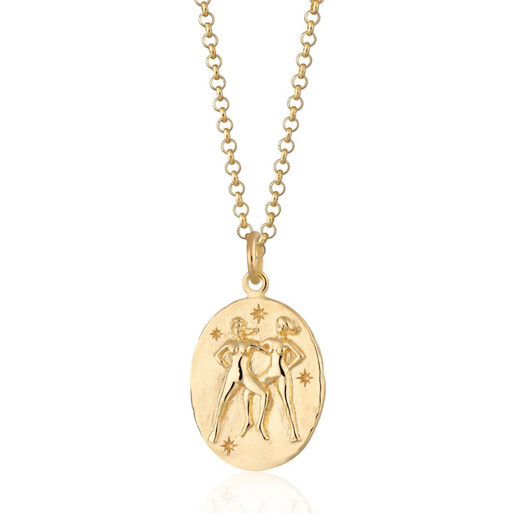 The Gold Gemini Zodiac Charm Necklace by Scream Pretty is a stunning astrological pendant for those with the Gemini star sign (May 21 - June 21). The front of the coin features an intricate design of two twinned figures that align with the Gemini constellation, and it's crafted from recycled sterling silver and plated in 18ct gold. This eye-catching celestial medallion embodies energy, wit, and intelligence.