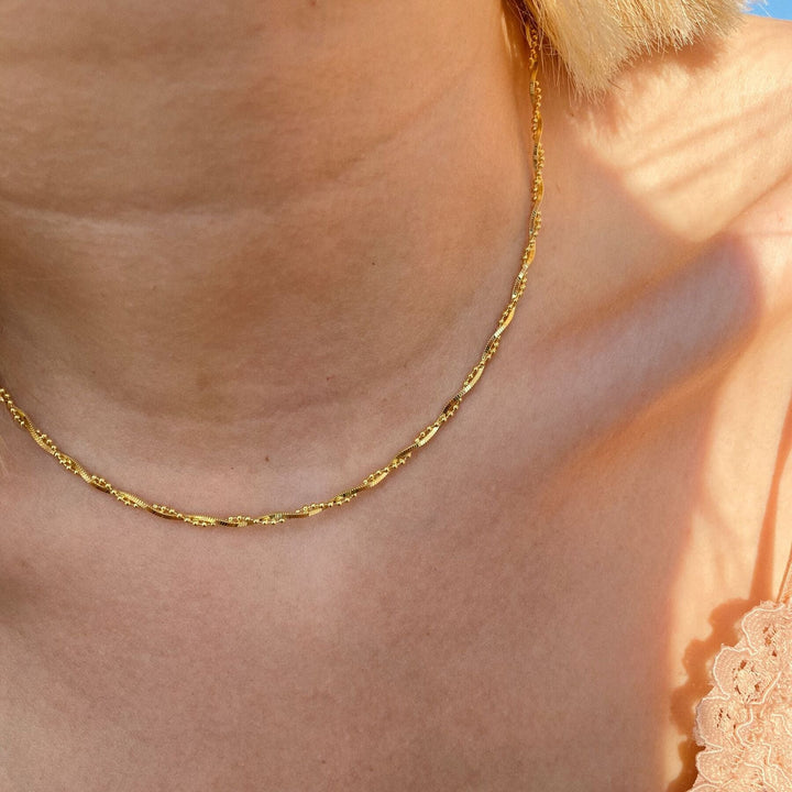 This necklace is crafted from 925 recycled sterling silver. It features a twisted design combining a snake chain and a beaded chain. It is 18 inches in length and adjustable. It is available in gold and silver tones.