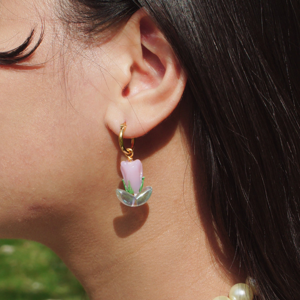 These earrings feature a soft pink glass tulip charm on a small golden hoop. The charm is detachable. The piece is made with a gold-plated hoop and a glass flower.