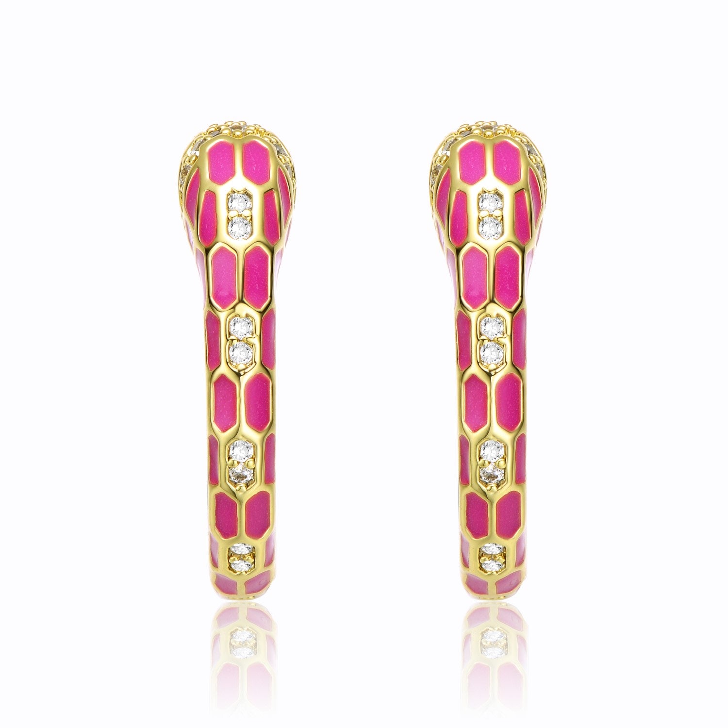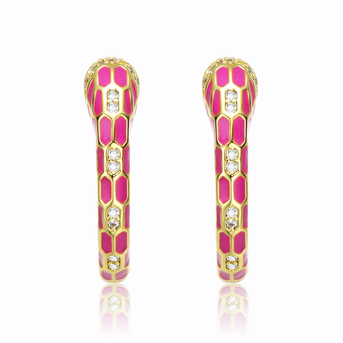 Yellow Gold Plated With Clear Cubic Zirconia Pink Enamel Python Snake C-Hoop Earrings