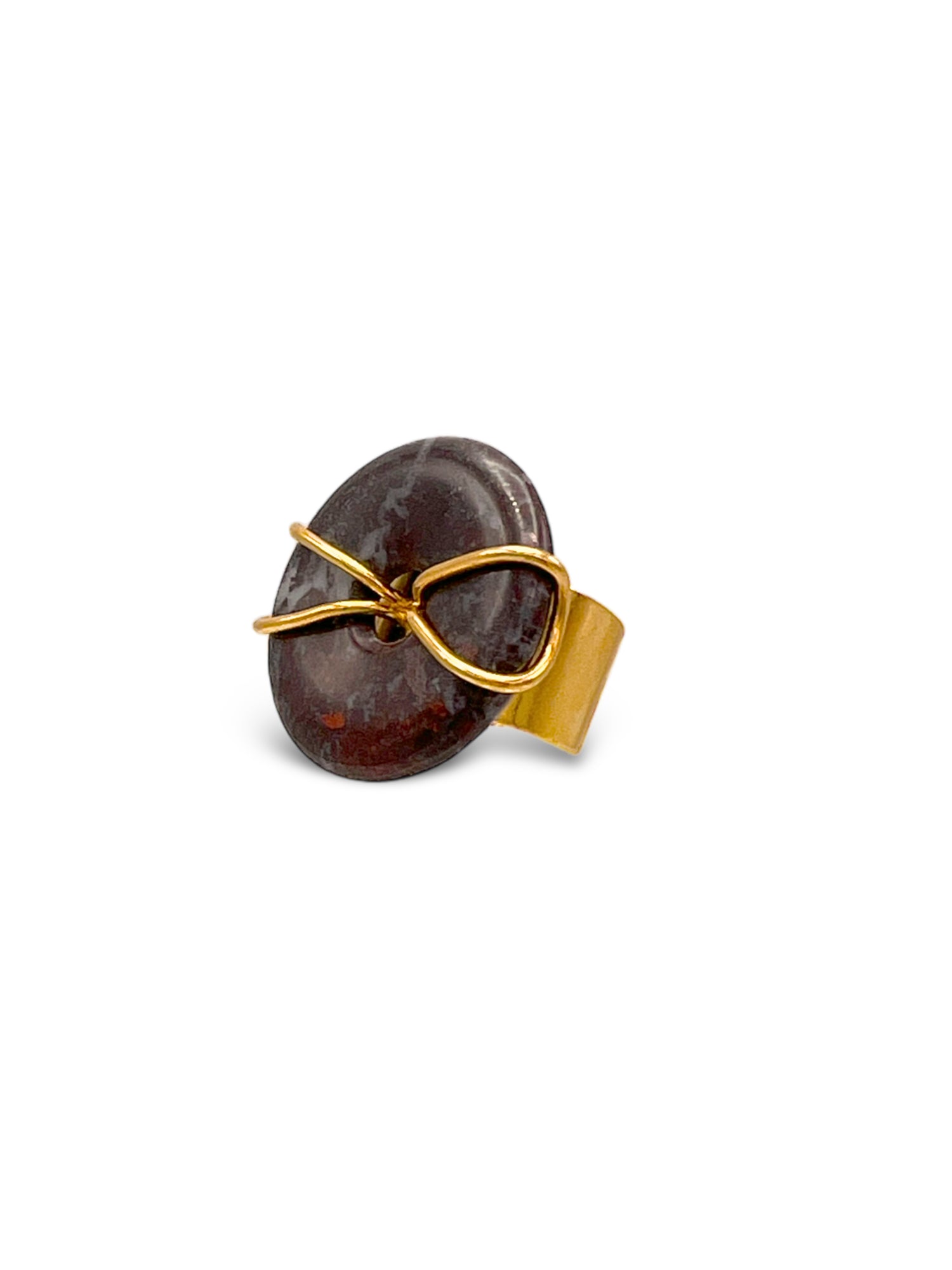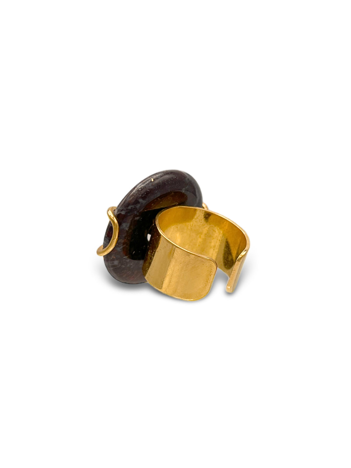 This adjustable ring is plated in 18K gold and features a polished jasper doughnut-shaped stone with a diameter of 32mm.