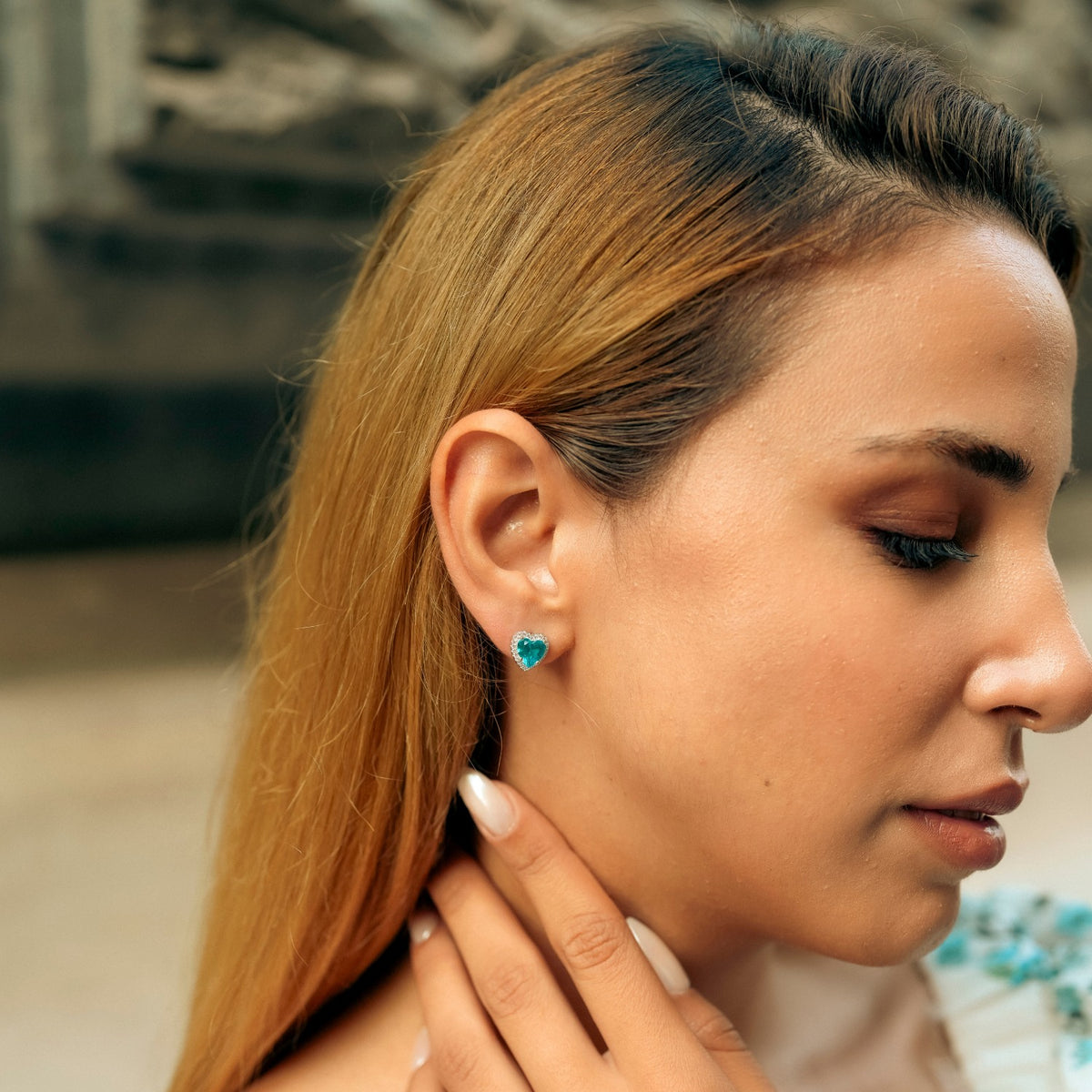 These stud earrings are made of 100% sterling silver with a blue, heart-shaped stone. They should be stored in a cool, dry place and gently wiped with a jewelry cleaning cloth.