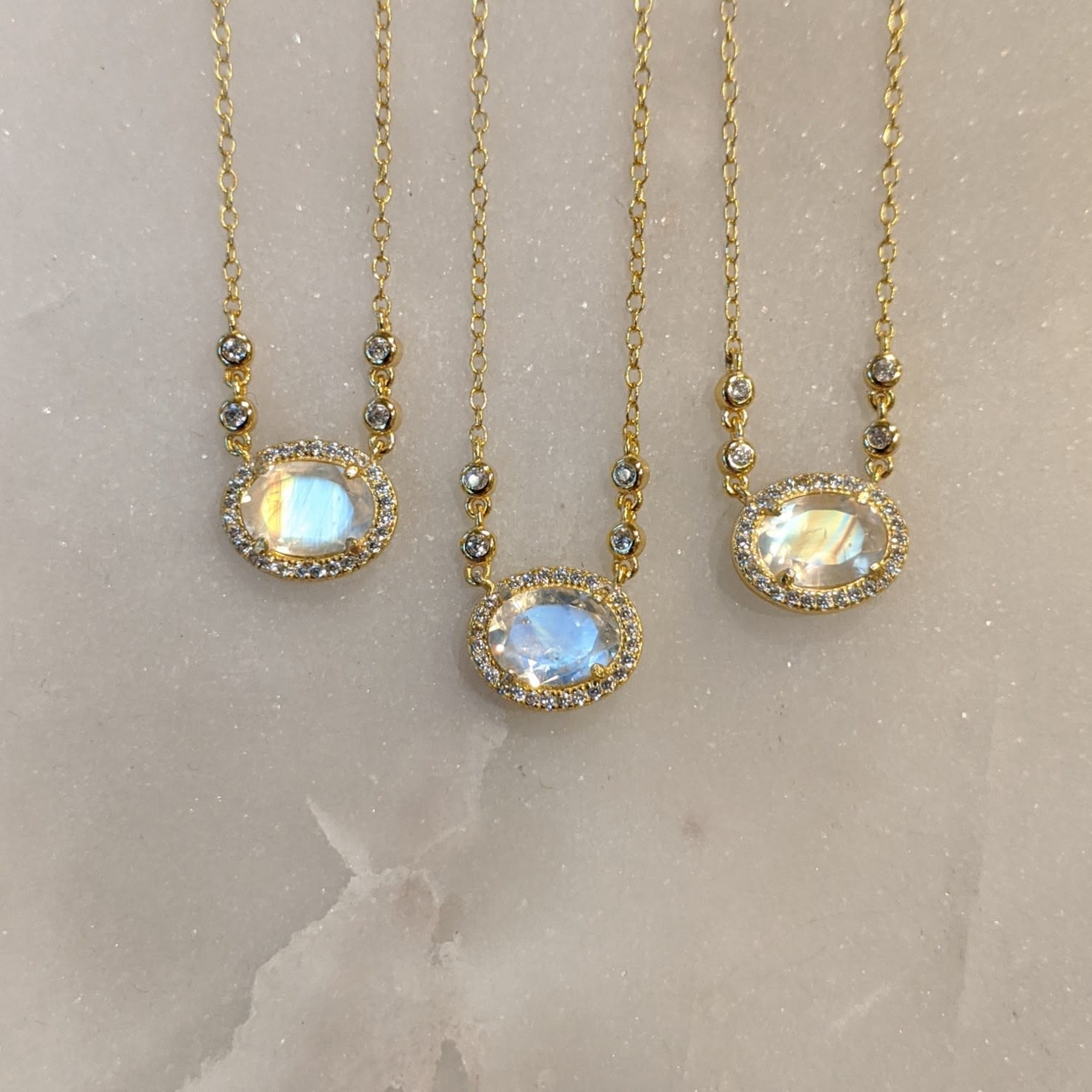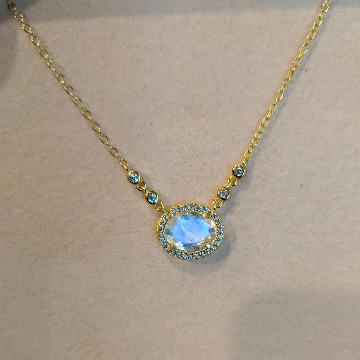 Gold-plated sterling silver with rainbow moonstone and crystal accents.