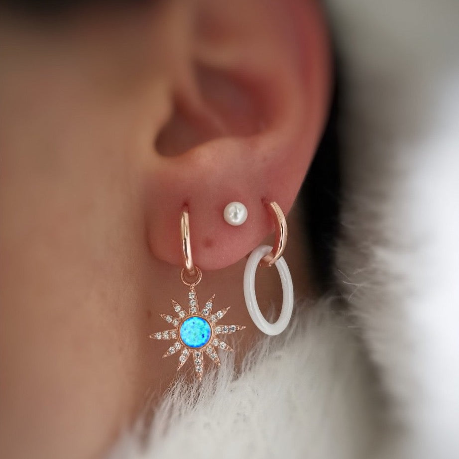 Crafted in recycled 925 sterling silver. Features opal stone in a sun-inspired drop design with hinged-back lock closure. Available in gold and silver.