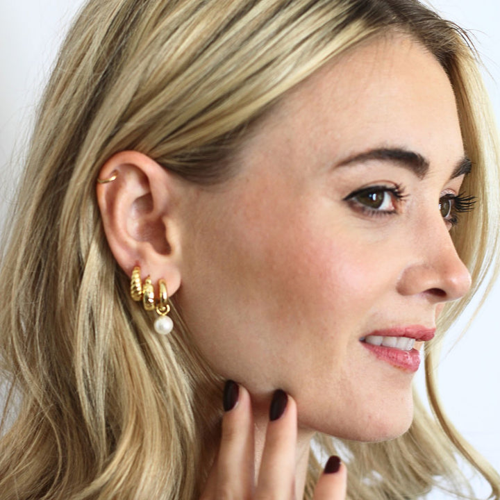 Recycled 925 sterling silver base with thick 14k gold plating. Dangling pearl charms. Waterproof, tarnish-free, hypoallergenic.