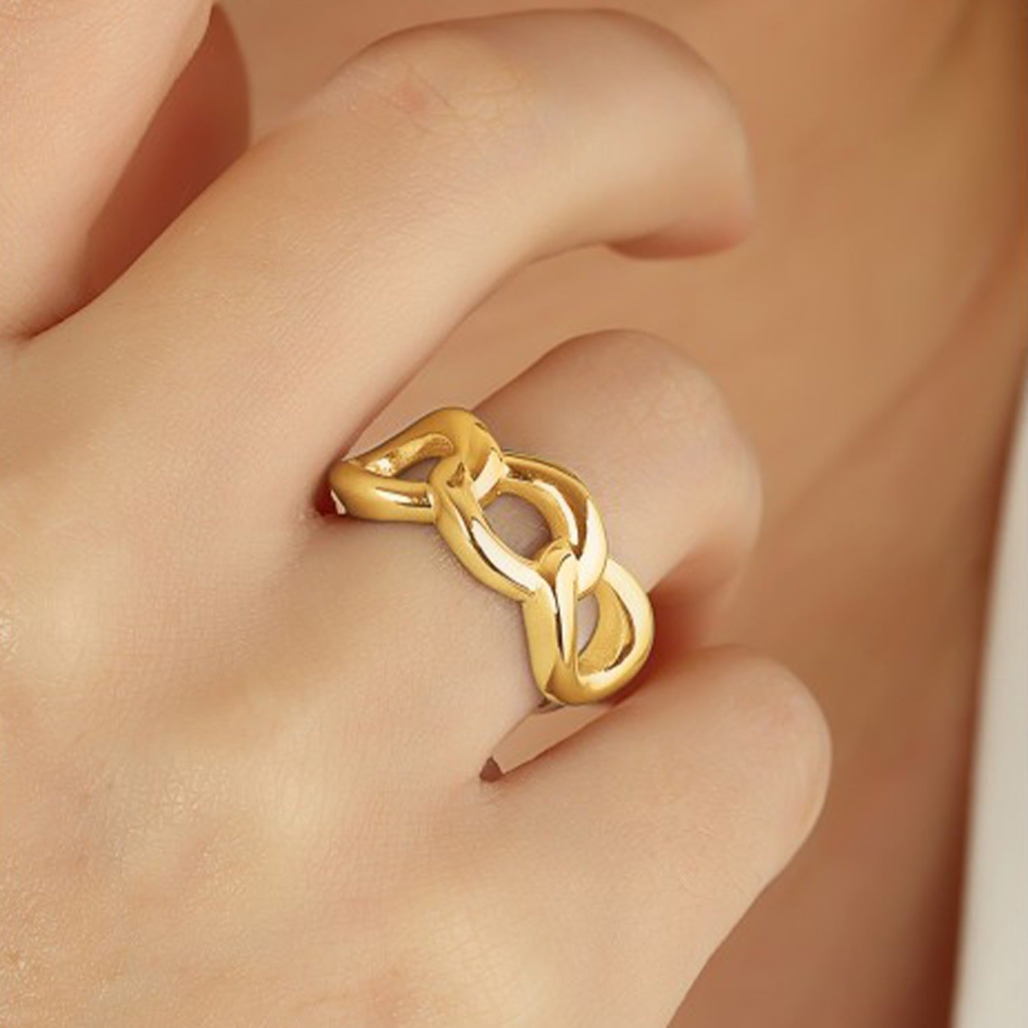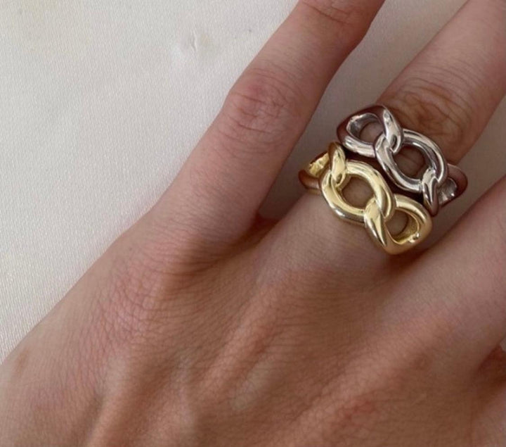 This adjustable ring is handmade with recycled sterling silver. It features a classic design with linking chain detailing and is available in silver and gold.