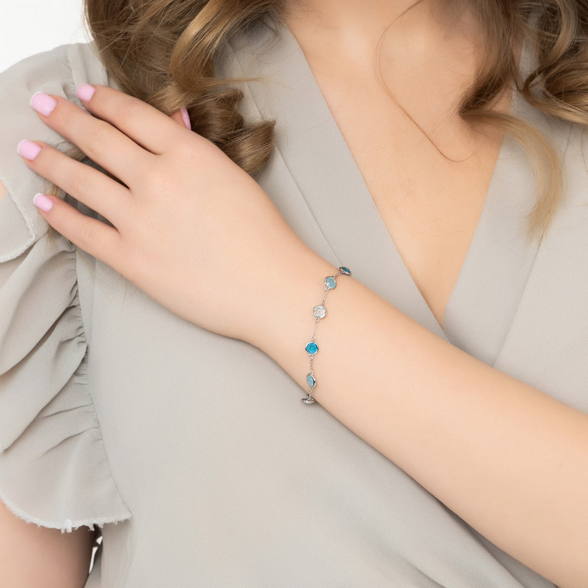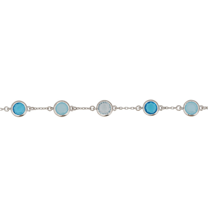 The Sardinia Bracelet Silver - The Blues by Latelita is a masterpiece that mirrors the tranquil depths of the ocean. It features an elegant chain with round gemstones at well-spaced intervals, including Blue Topaz, Blue Chalcedony, and Swiss Blue Topaz. Each gemstone brings its own story and symbolic meaning. This bracelet is handcrafted in 925 Sterling Silver and creates a harmonious blend of color and light.