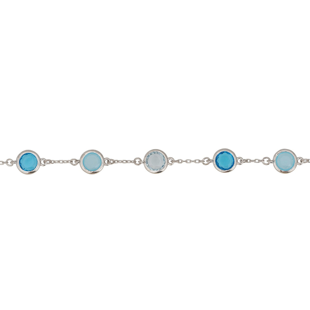 This bracelet is handcrafted with 925 sterling silver and features lab-created Blue Topaz, Blue Chalcedony, and Swiss Blue Topaz.