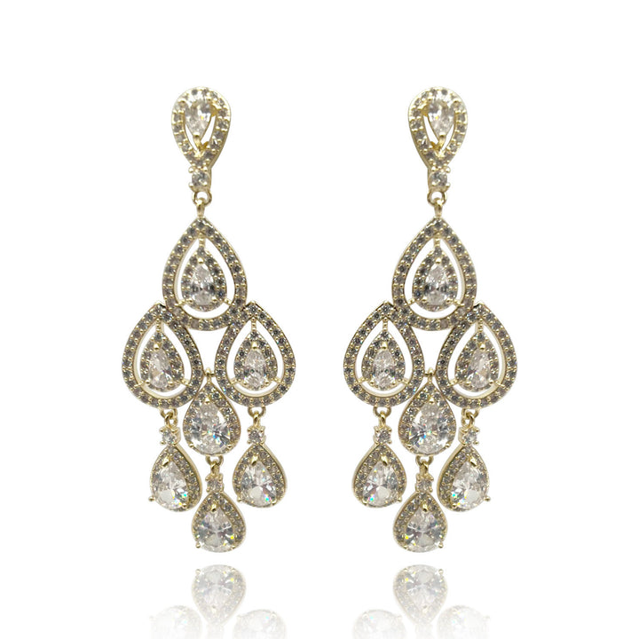 These drop earrings are set in a gold-plated setting and feature pear-shaped crystals. They have a clip-on style closure.