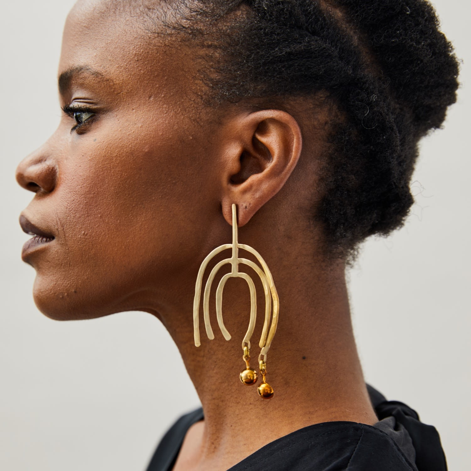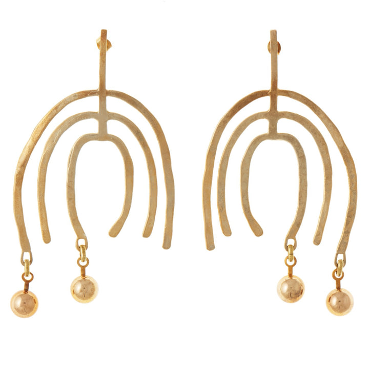 These Bridge Earring by Castlecliff are a stunning statement piece inspired by petroglyphs and Arizona's Rainbow Bridge. The abstract design is handcrafted in NYC from 100% certified recycled brass via the ancient art of lost wax casting, ensuring each piece is unique. The raw brass will achieve a rich patina over time, making it a personal and one-of-a-kind accessory. This piece is perfect for those who want to express their unique and artistic style.