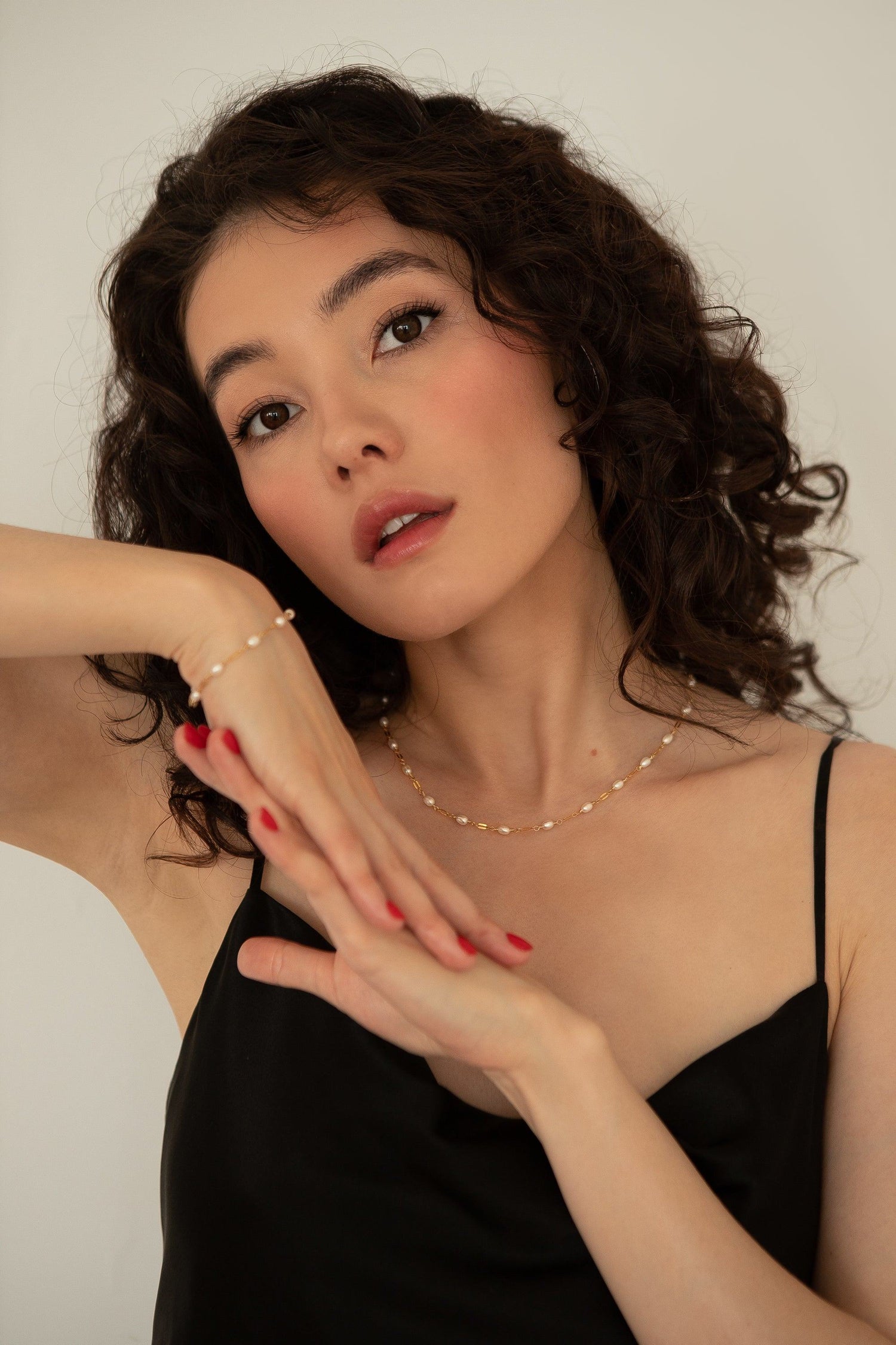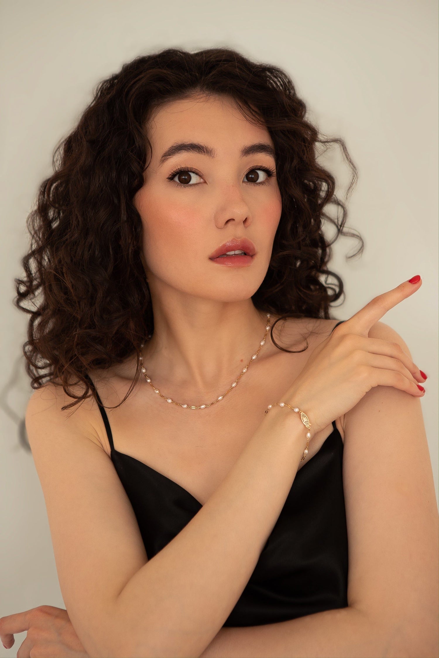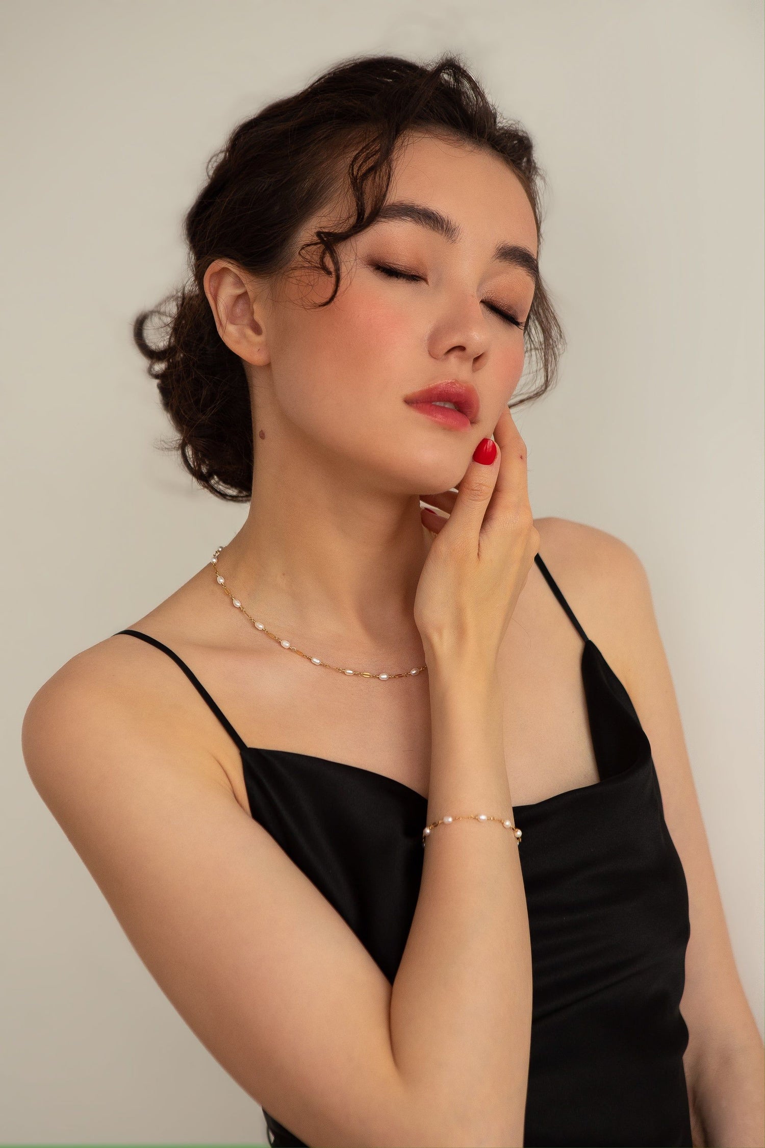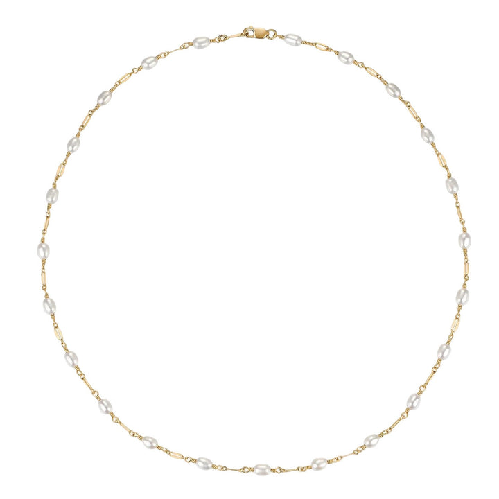 This necklace is handcrafted with natural freshwater rice pearls and a delicate gold-filled chain. It is hypoallergenic and safe for sensitive skin.