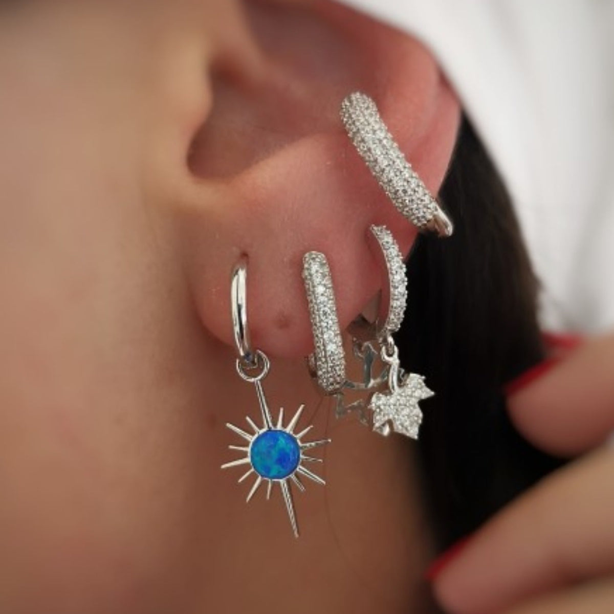 Blue Opal Northern Star Starburst Drop Hoop Earring by Spero London captures the enchanting beauty of the night sky. Fashioned in 925 recycled sterling silver, these earrings feature a star-shaped drop with an elegant opal stone at the center of a hoop, creating a look that is both fascinating and stylish. The hinged-back lock ensures a secure and comfortable fit, while the gleaming silhouette adds a touch of celestial charm to any outfit.