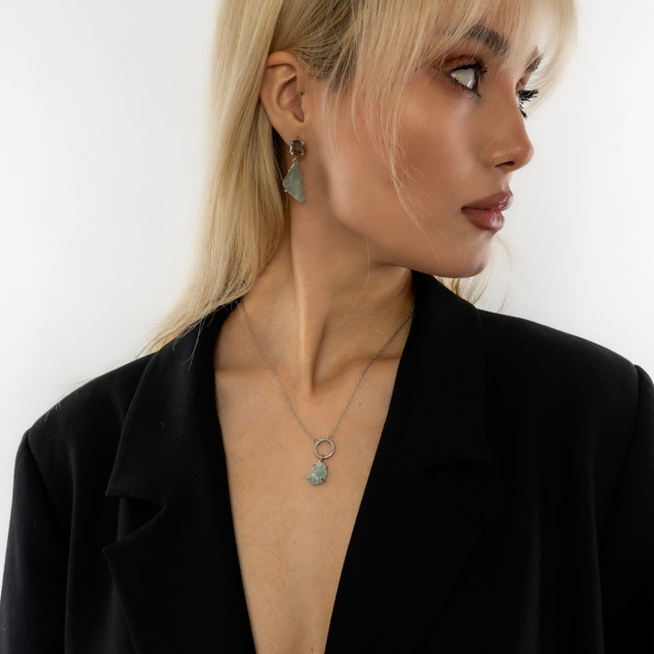 This Raw Chalcedony Gemstone Pendant Chain Link Silver Necklace by Mejoma features a natural chalcedony gemstone that directly touches the body, providing potential benefits like emotional balance and enhanced communication. With minimal processing, this raw gemstone is perfect for anyone seeking a natural and beneficial accessory. The necklace is made from nickel-free, 100% recycled brass.