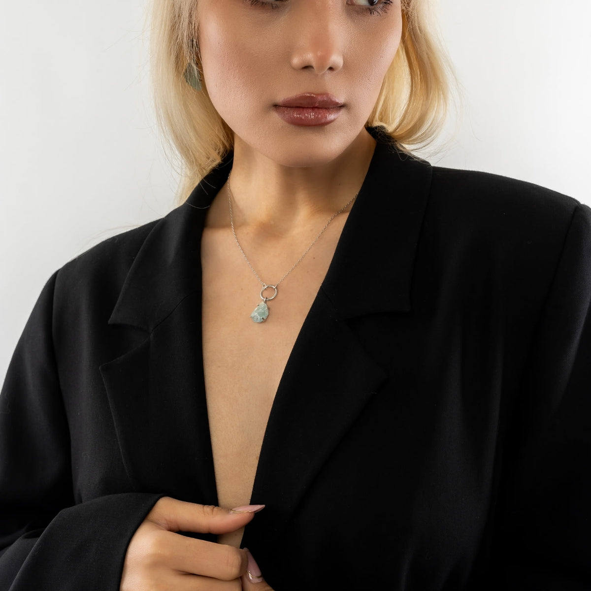 This necklace is made from nickel-free, 100% recycled brass. It features a natural chalcedony gemstone pendant. It should be taken off when washing hands or using cosmetics and skincare products.