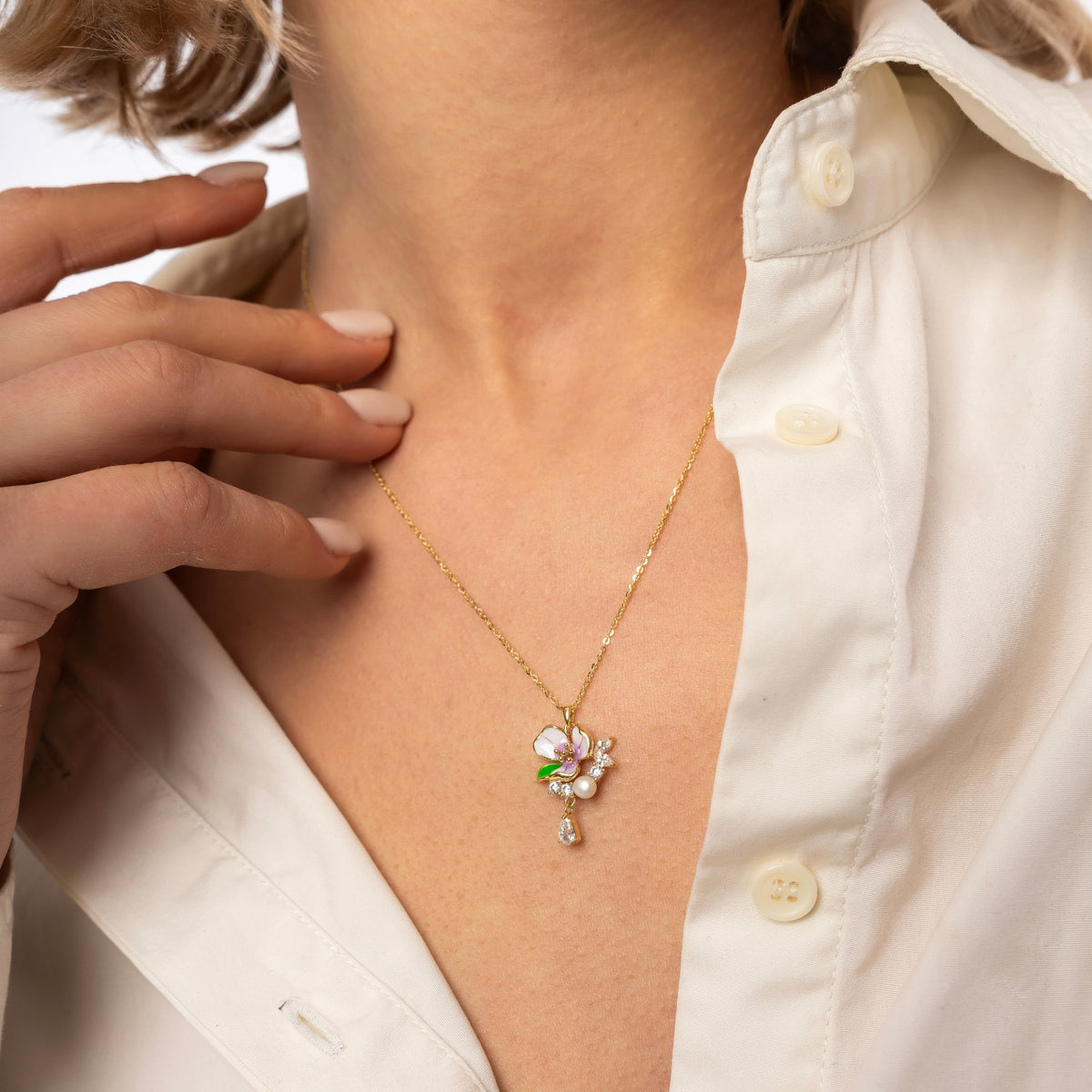 This necklace is crafted from 100% fine sterling silver with a gold finish and features a delicate pansy violet flower design.