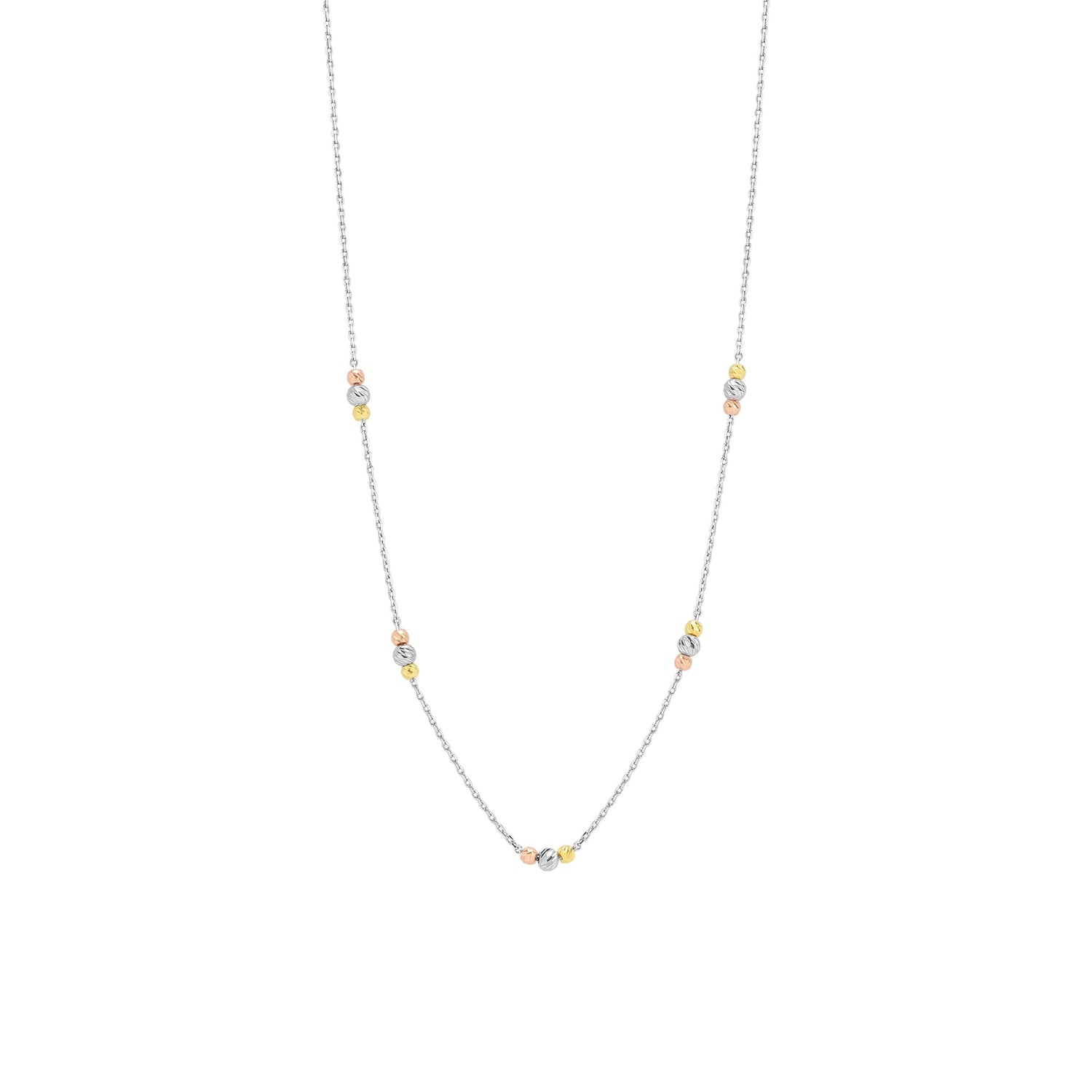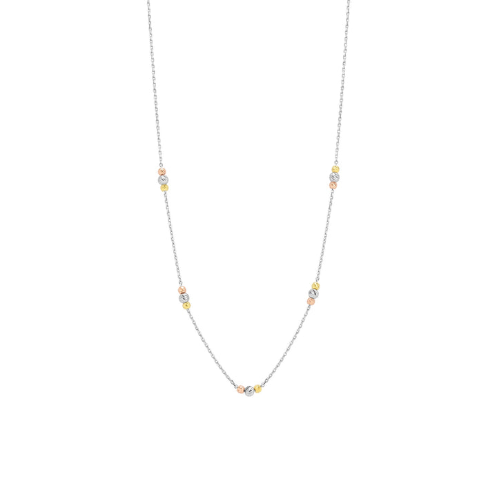 This Dorissa Three Bead Sterling Silver Necklace by Spero London is a beautiful and elegant piece that adds a subtle pop of color and sophistication to any outfit. The necklace features a unique mix of rose gold, gold, and silver beads, creating a harmonious and versatile design. Perfect for everyday wear or special occasions, this necklace is a must-have for any jewelry collection.