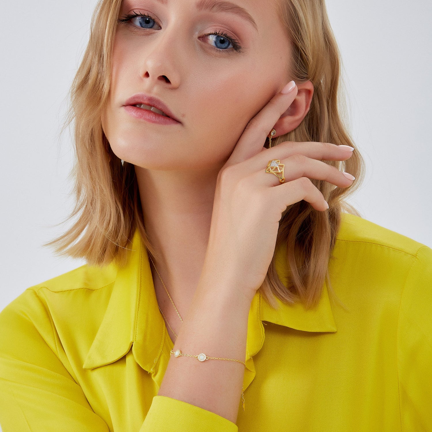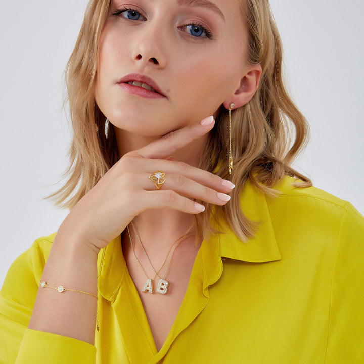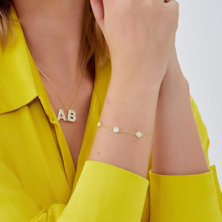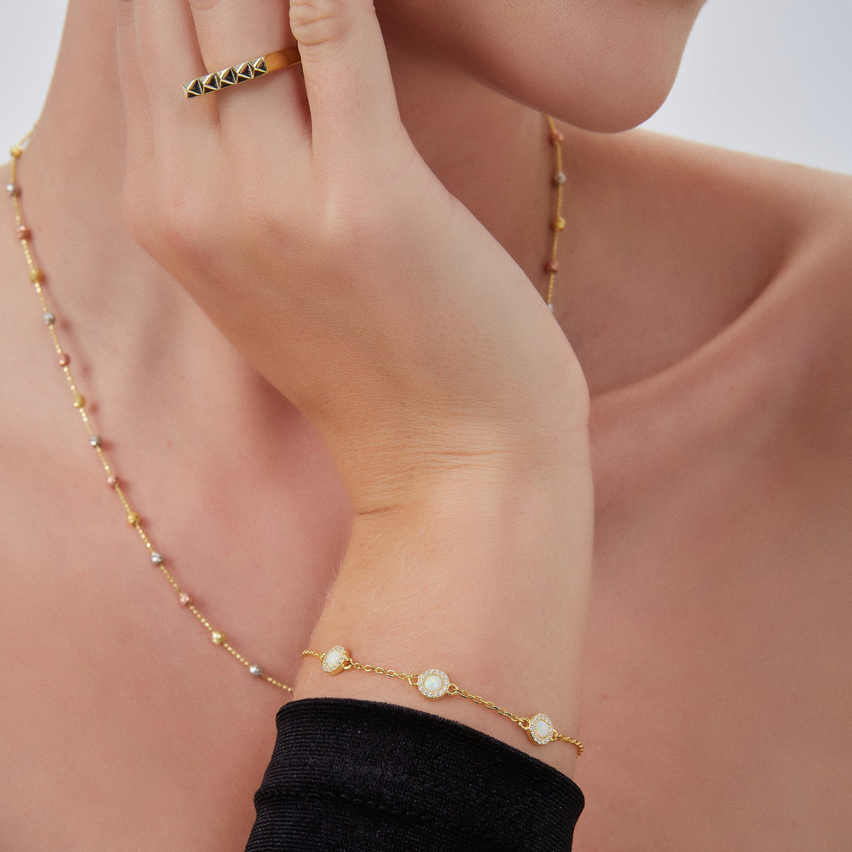 This bracelet is handcrafted from 100% gold vermeil sterling silver and features white opal gems.