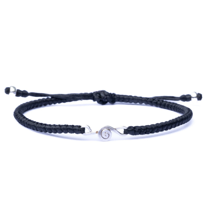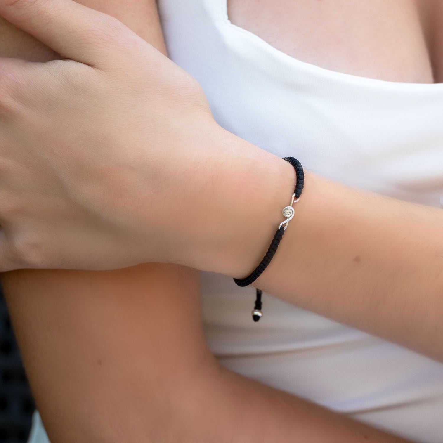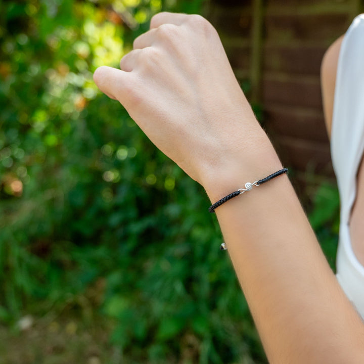 This bracelet is crafted from sterling silver and features a waterproof black vegan wax cord with handmade knots.