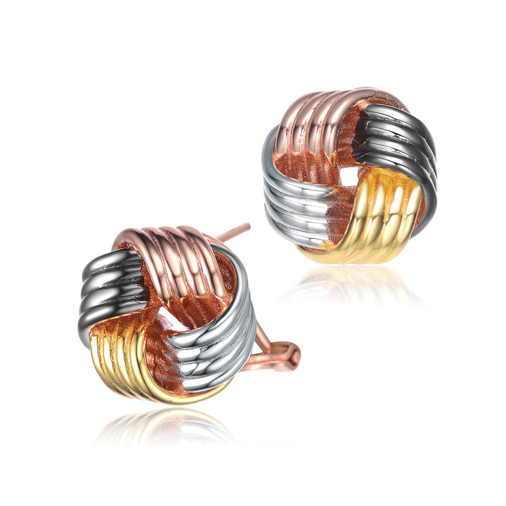 These Sterling Silver Multi Colored Knot Earrings by Genevive Jewelry are a stylish and modern accessory that exudes a playful sophistication. The intricate knot design, crafted from sterling silver with multi-colored plating, creates a unique and captivating look. The blend of 14K gold, rhodium, black, and 18K rose gold platings gives them a versatile appeal, perfect for creating stylish combinations. Secured with a butterfly closure, these studs are a beautiful and contemporary addition to any jewelry collection.