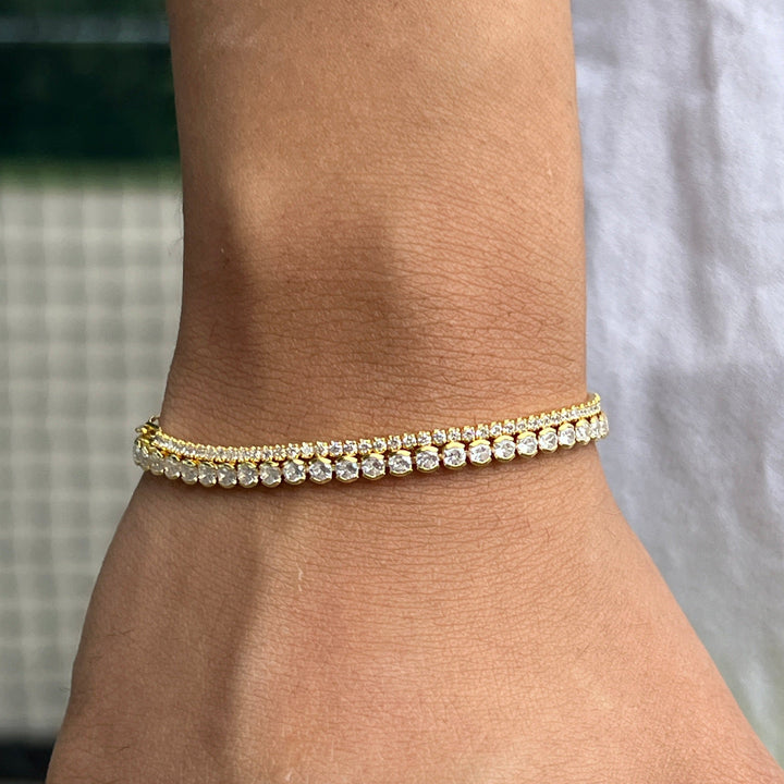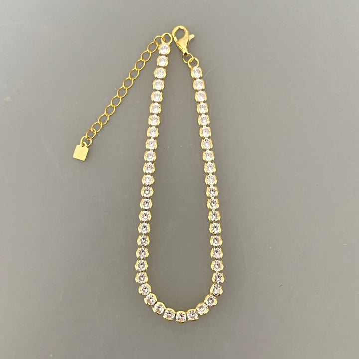 This Dainty Gold Bezel Tennis Bracelet by Nazzar is a refined and elegant accessory. It features sparkling cubic zirconia stones individually set in delicate bezel settings, offering timeless sophistication and understated glamour. Made with a 100% recycled sterling silver base and a thick layer of high-quality 14k gold plating, this bracelet is waterproof, tarnish-free, and hypoallergenic, making it a perfect addition to any ensemble.
