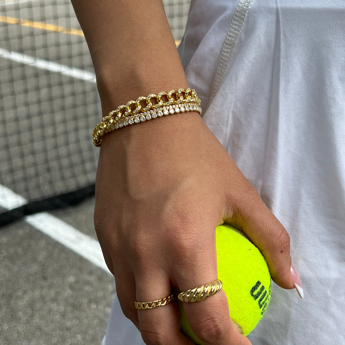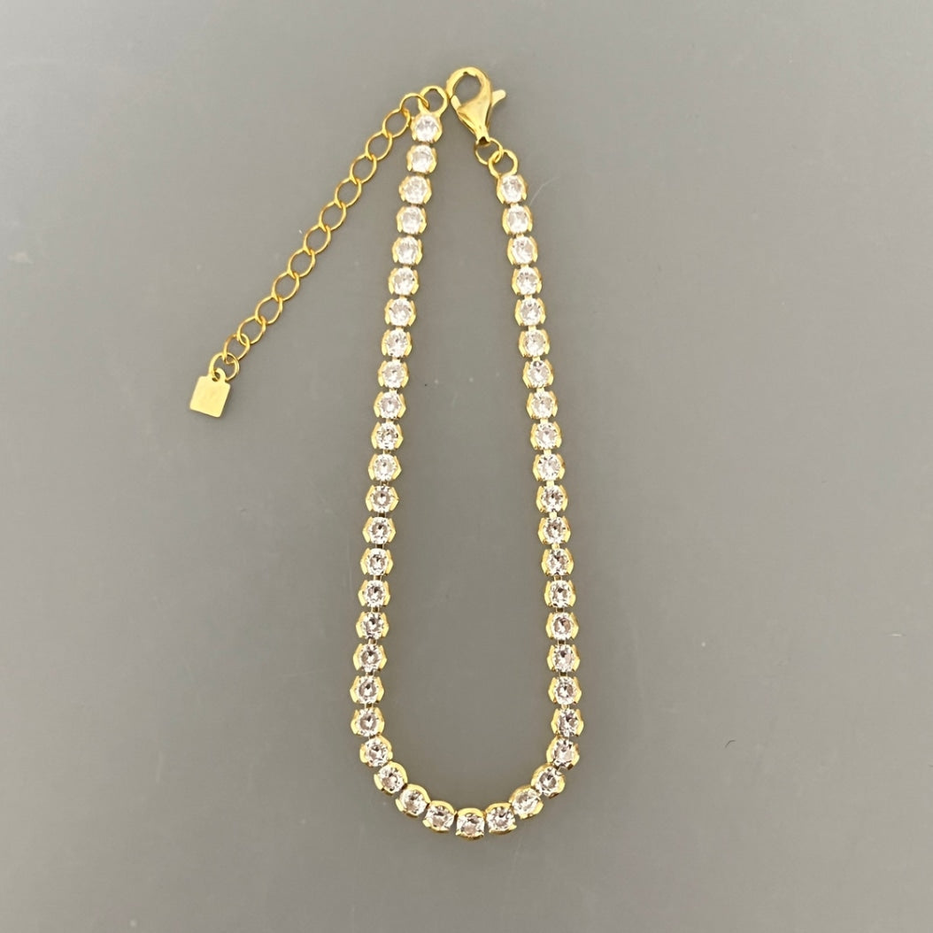 This bracelet is made of a 100% recycled sterling silver base with a thick layer of high-quality 14k gold plating. It is engraved with cubic zirconia stone.
