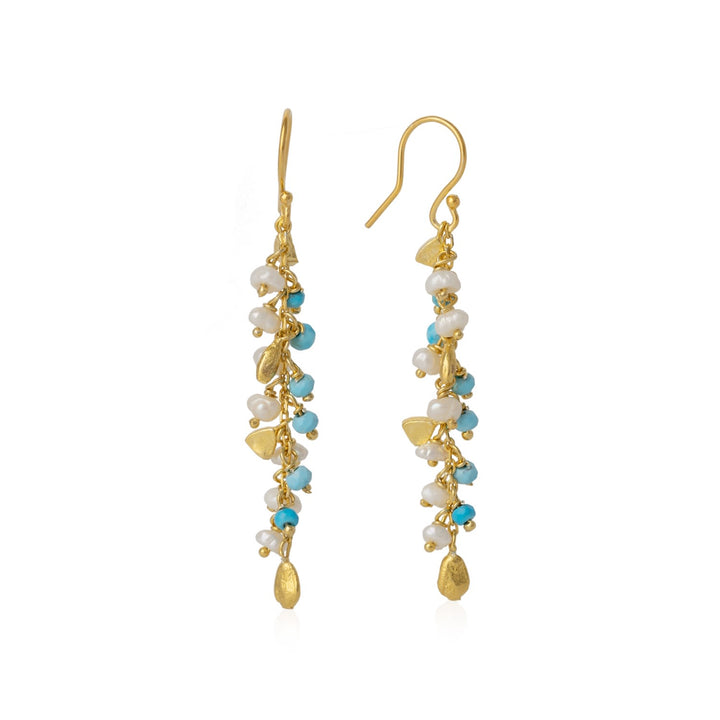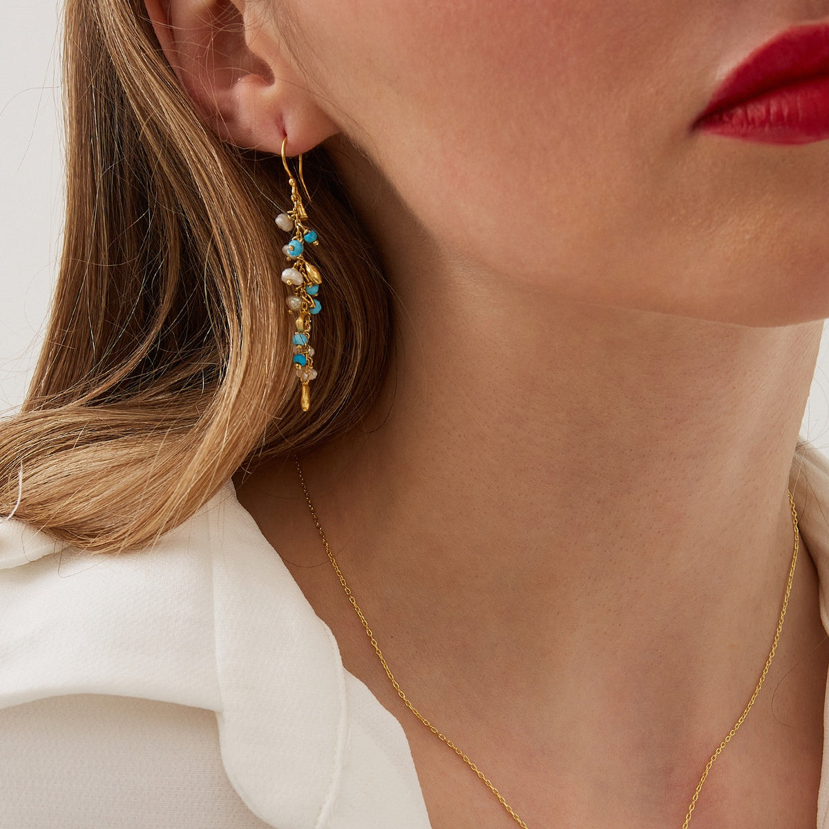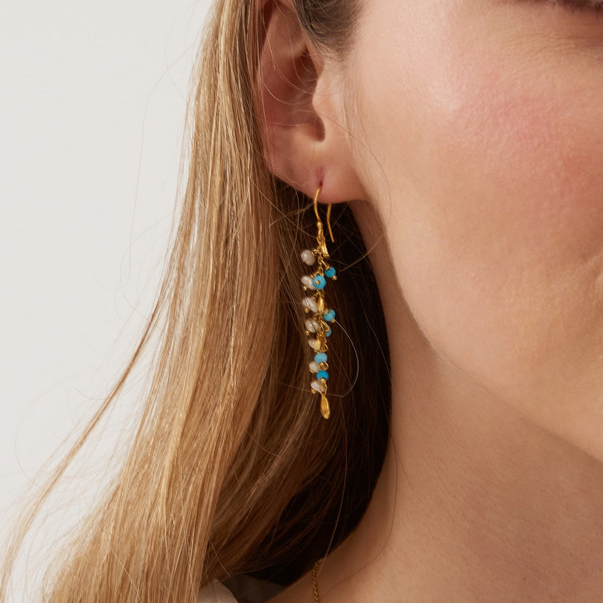 These earrings are handmade from 925 recycled sterling silver and are embellished with multiple Baroque pearls and natural turquoise gemstones.