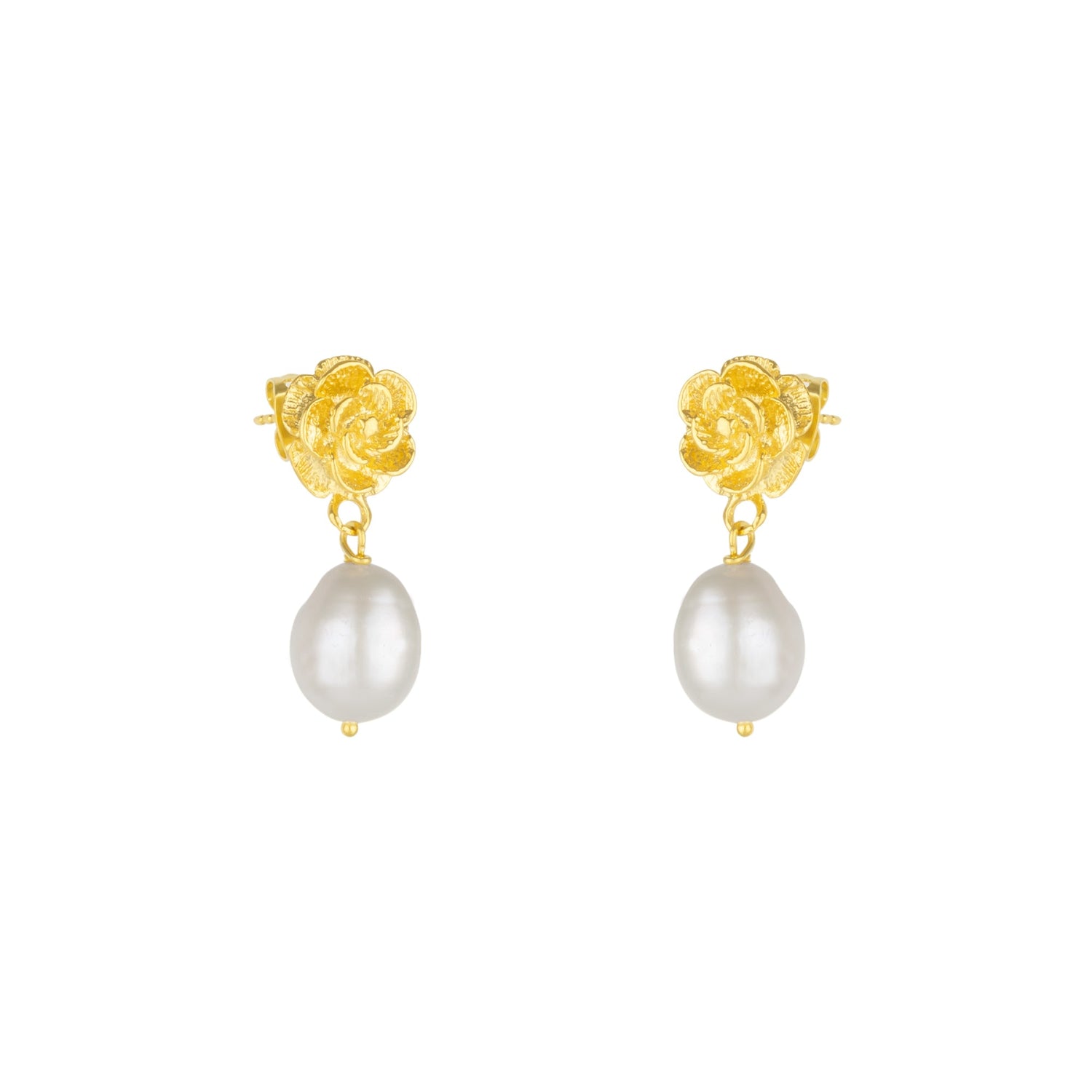 These earrings are crafted from a gold-toned metal. The rose is 11mm in diameter, and the natural pearl drop ranges from 9-12mm. The total earring length is 25mm.