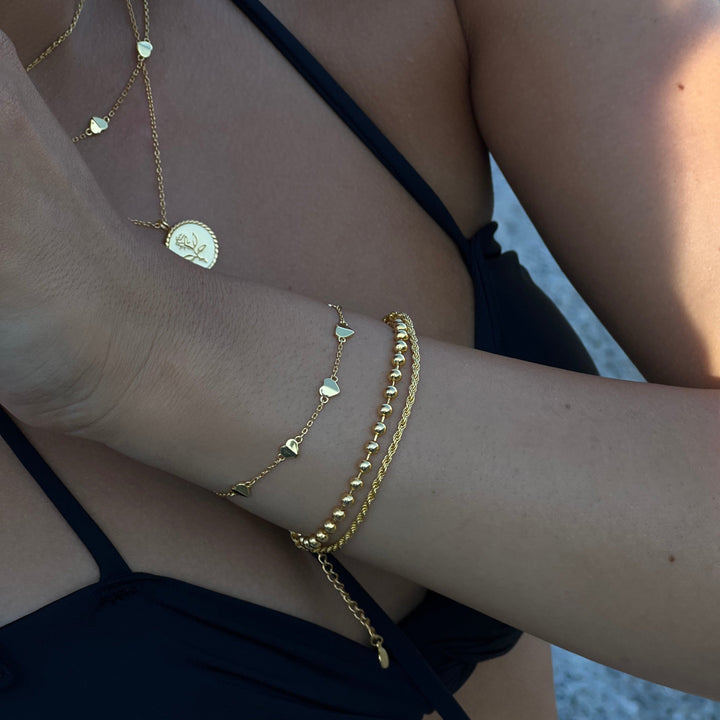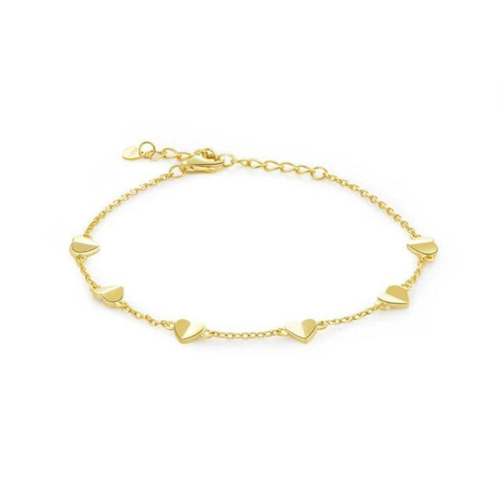 This Gold Heart Station Bracelet by Nazzar adds a touch of romance and elegance to your look. Featuring delicate heart charms placed along a golden chain, it exudes sweetness and simplicity. Versatile for everyday wear or layering, this bracelet is a charming symbol of love designed with modern durability in mind.