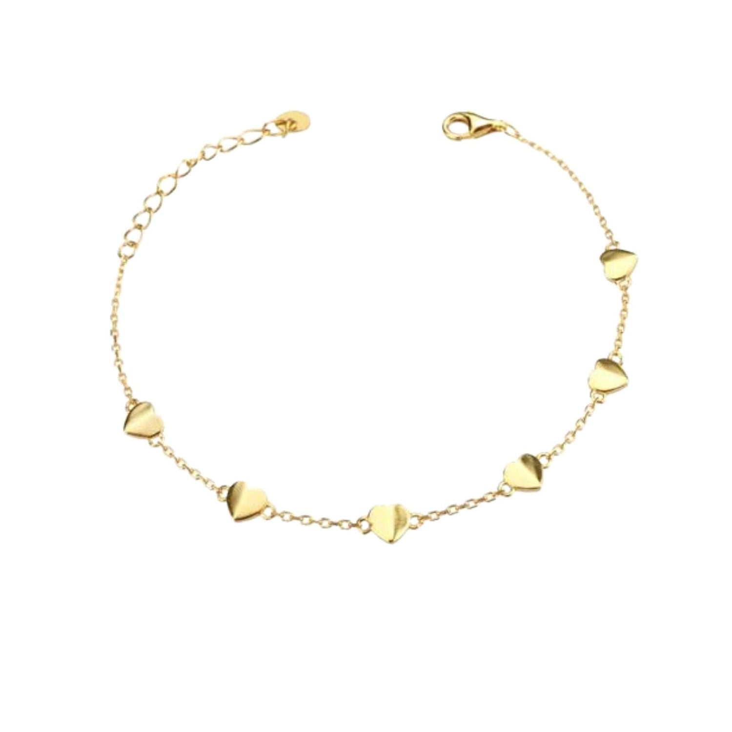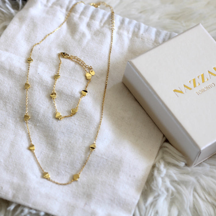 Crafted in 100% recycled Sterling Silver with 14K Gold plating. Features dainty heart charms on a station chain. Waterproof, tarnish-free, sweatproof, and hypoallergenic. Includes 925SS stamp.