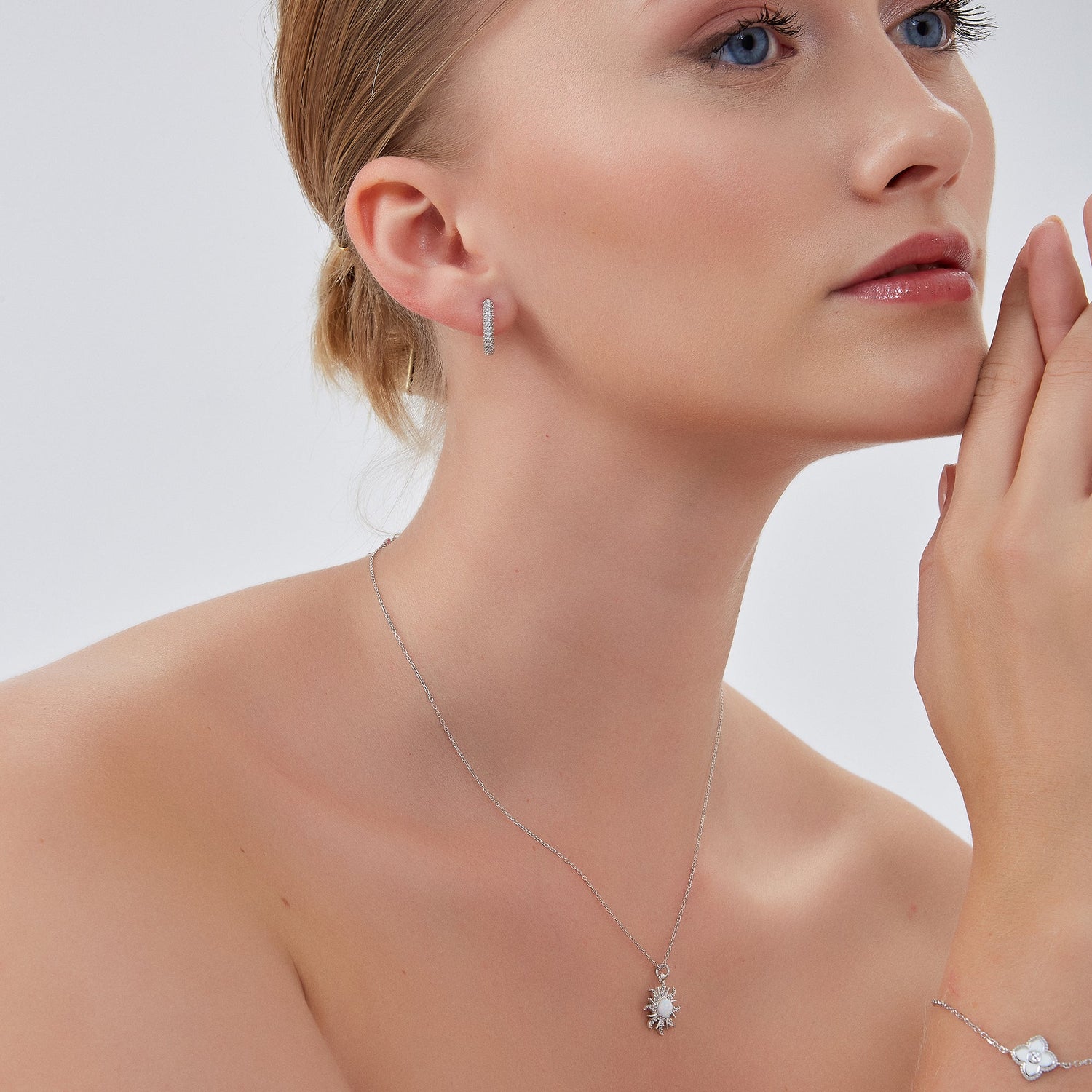 This necklace is crafted from sterling silver with a white opal sun and sunburst charm.