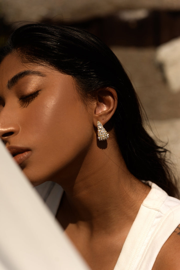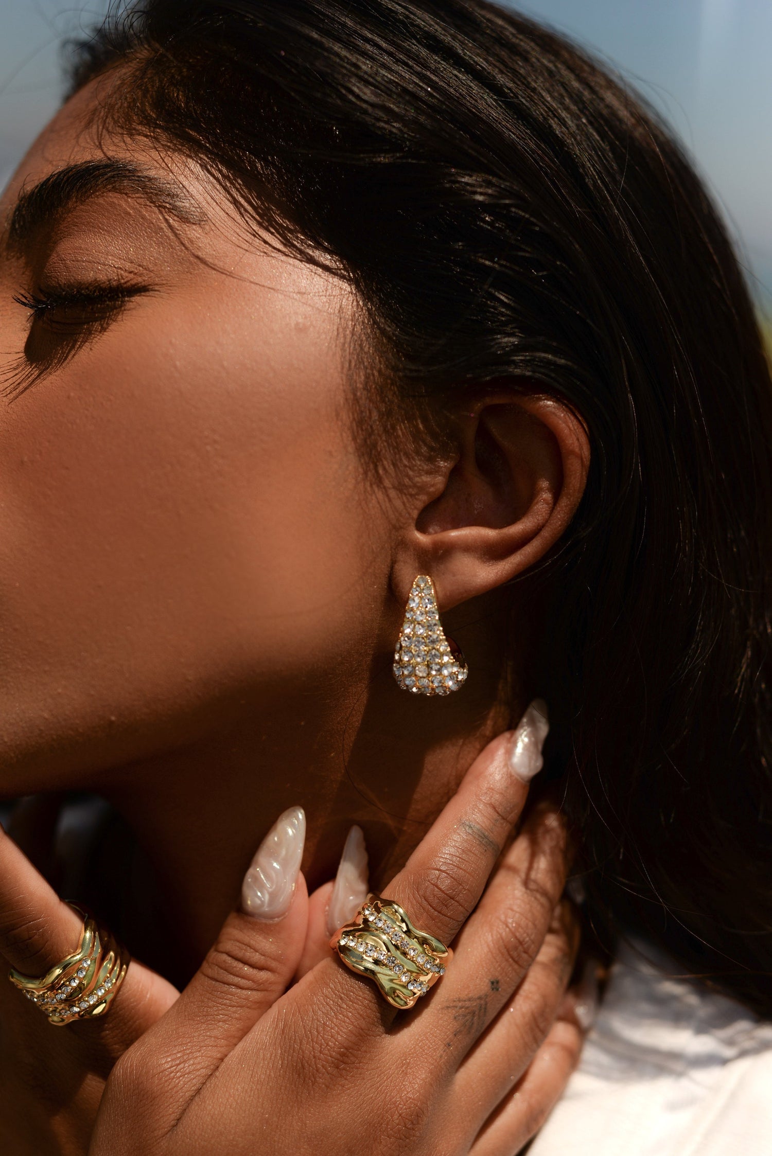 These Hira Bold Earrings Gold by Drae Collection are a dazzling accessory designed to draw attention. The unique rain drop design is encrusted with pave cubic zirconia for a captivating shine that will sparkle from far away. Made with silver plating over an unspecified metal and AAAA grade cubic zirconia, these earrings are a bold and eye-catching statement piece.
