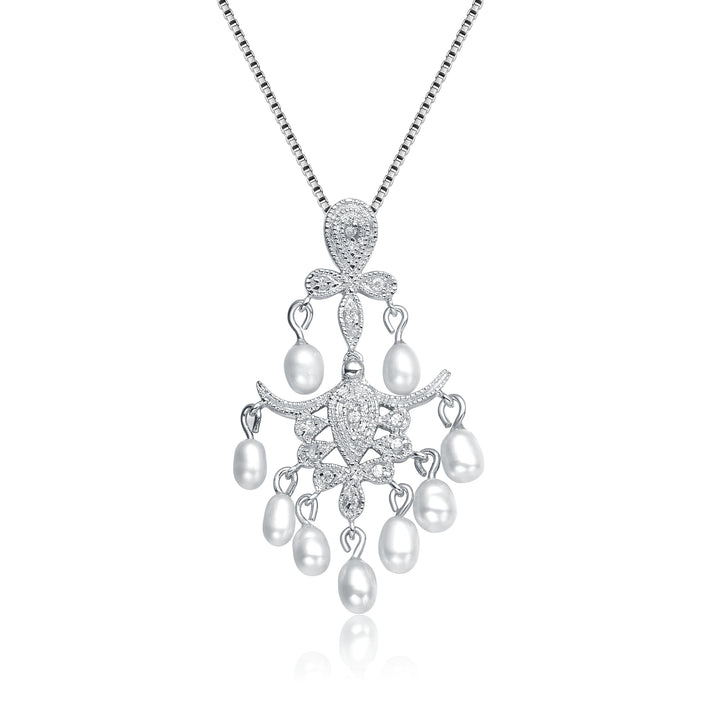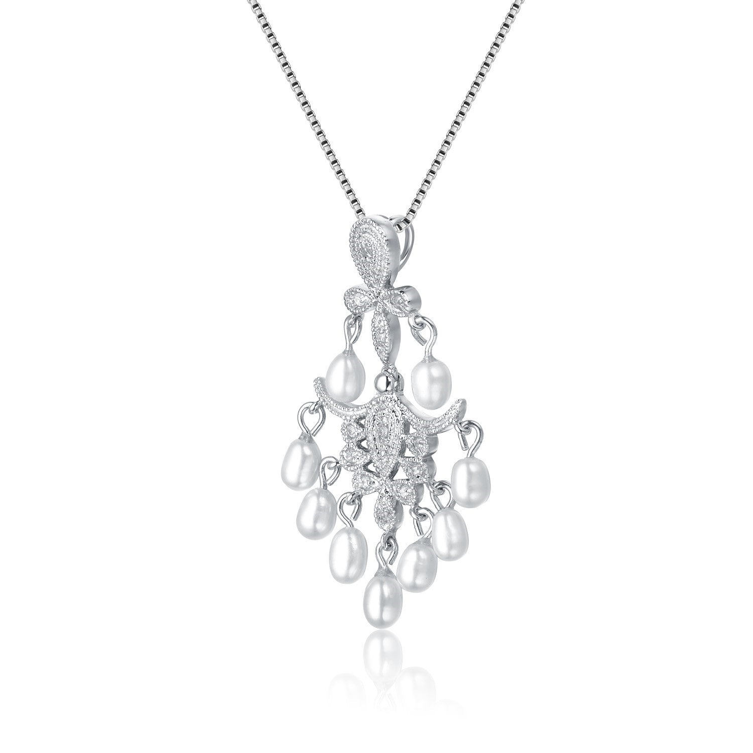 This necklace is crafted from sterling silver and features a mini chandelier design with cubic zirconia stones.