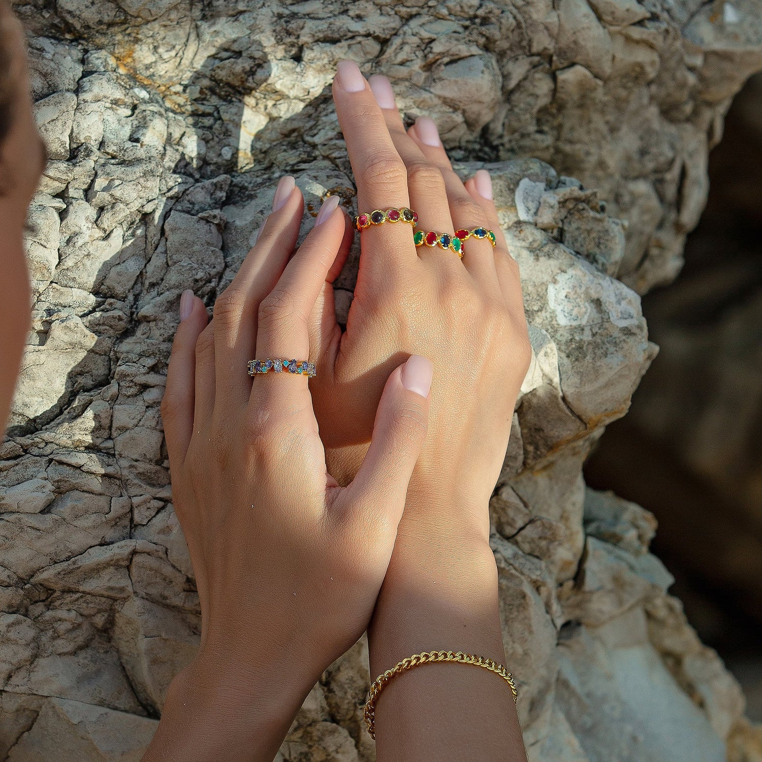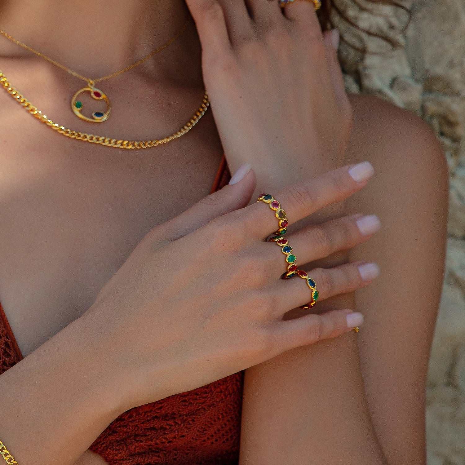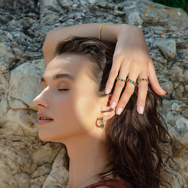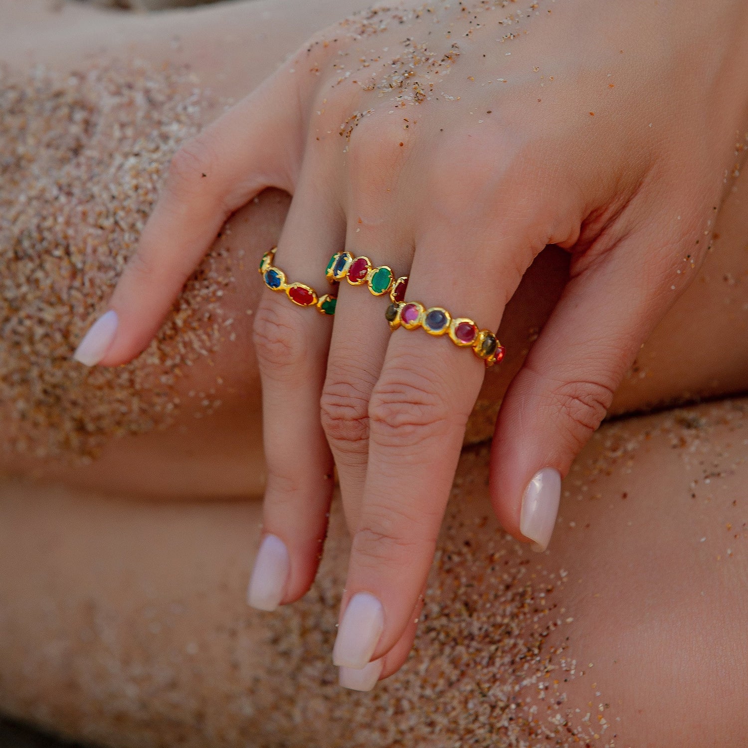 The Aurora Crown Gold Oval Ring by Mejoma is a dazzling piece that unleashes your inner royalty. This ring features an array of colorful gemstones surrounding a stunning 5mm oval gemstone, creating a luminous and elegant look. It's a beautiful symbol of your unique style, grace, and inner royalty.