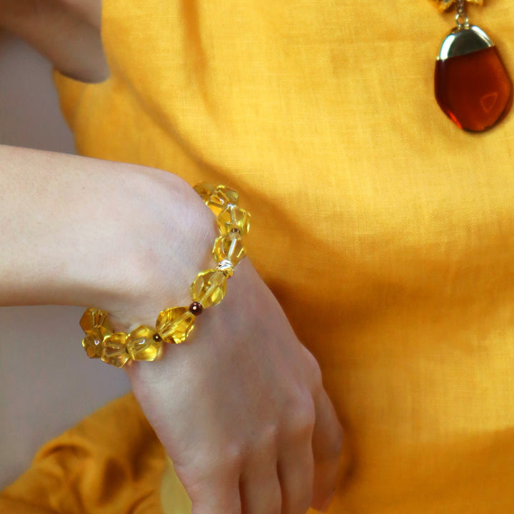 This Citrine Natural Stone Bracelet by Lara Ari is a striking and elegant accessory. Handcrafted with luminous citrine stones in warm golden tones, it adds a bold touch of natural brilliance to any style. Known as the "merchant's stone," citrine is believed to symbolize abundance, vitality, and optimism. This bracelet is more than just a beautiful piece; it’s a wearable source of positive energy and a reminder of your inner strength and creativity. It is perfect for both everyday wear and special occasions.