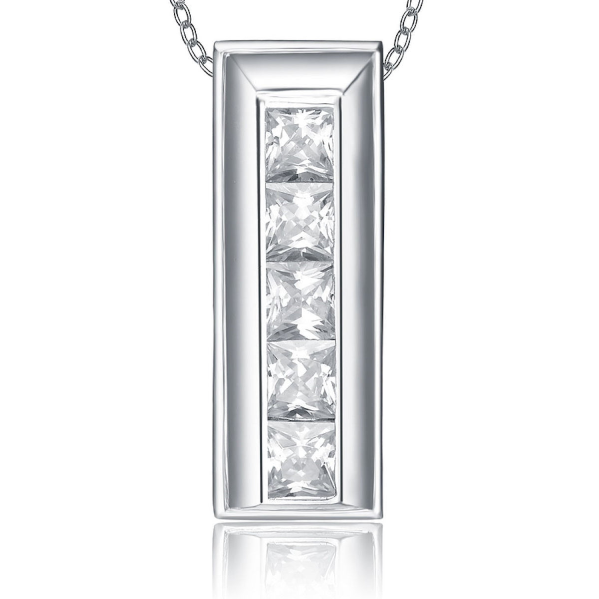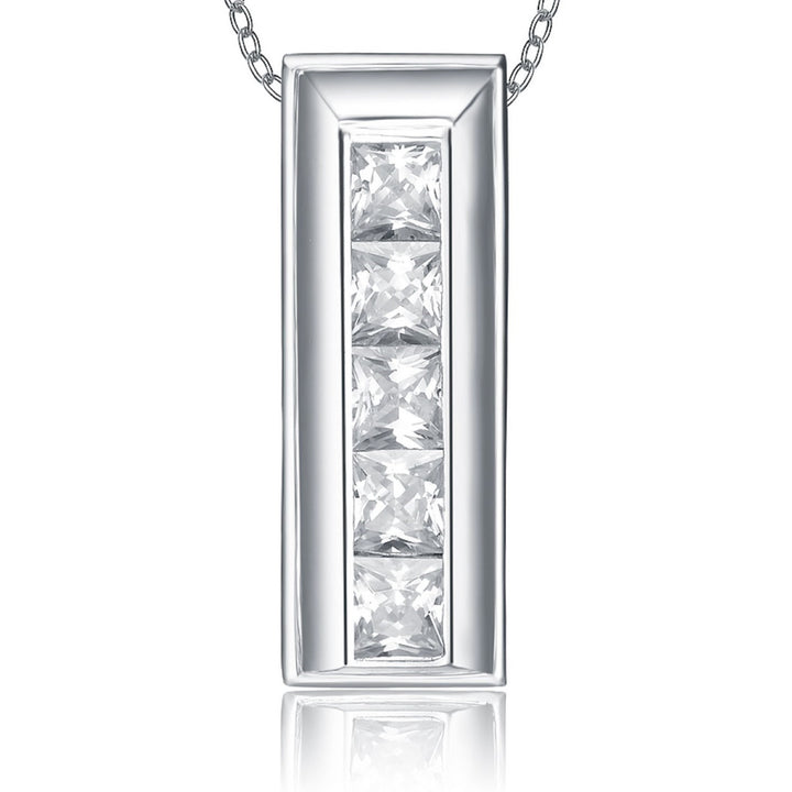 This necklace is crafted from sterling silver and features a square frame design. It is complemented by clear cubic zirconia stones in a linear style.
