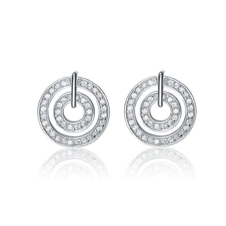 These earrings are crafted from sterling silver with white gold plating, featuring a dual circle design and encrusted with clear cubic zirconia stones.