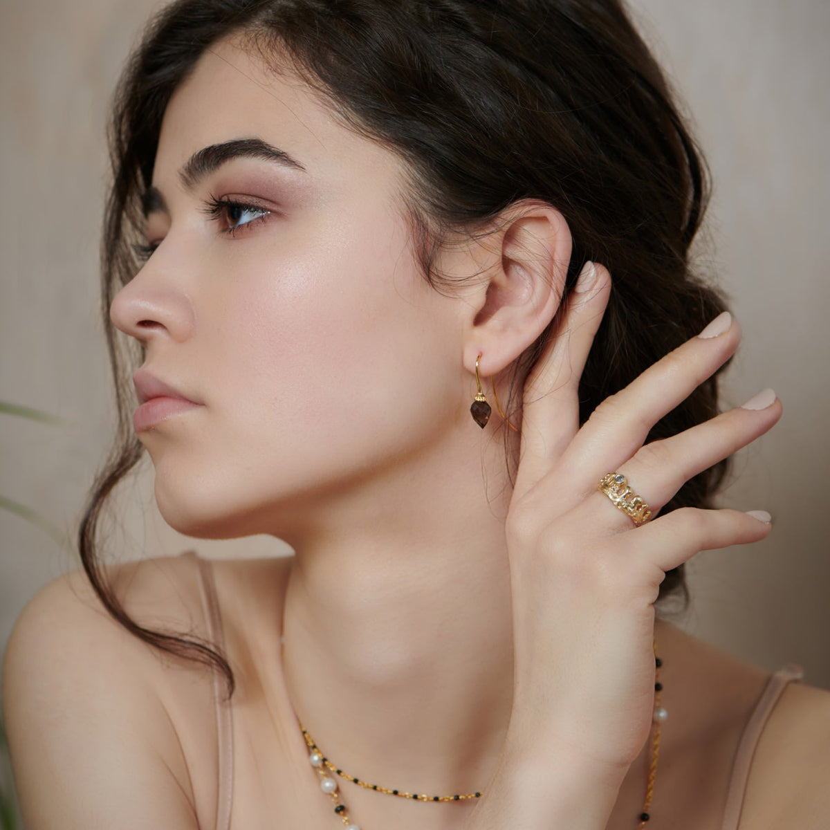 These Sekhem Smoky Quartz Gold Vermeil Drop Earrings by Janus Edinburgh are a bold and elegant accessory that evokes a sense of ancient mystery. Shaped like a guiding lantern or a luscious piece of fruit, these earrings feature a striking contrast between the angular facets of the smoky quartz and the smooth, sinuous gold vermeil hooks. The name "Sekhem" links them to the Ancient Egyptian concept of the spirit or soul, adding a layer of symbolic depth. They are a simple yet alluring statement piece perfect for adding a touch of sophisticated drama.