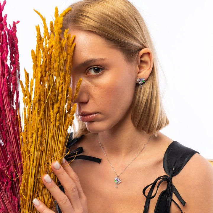 These earrings are crafted from 100% fine sterling silver with a gold finish and feature intricate floral designs with violet hues.