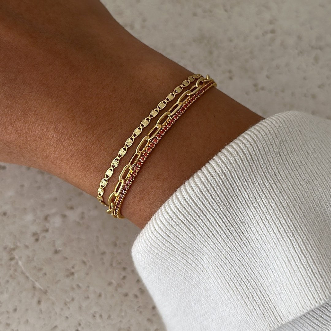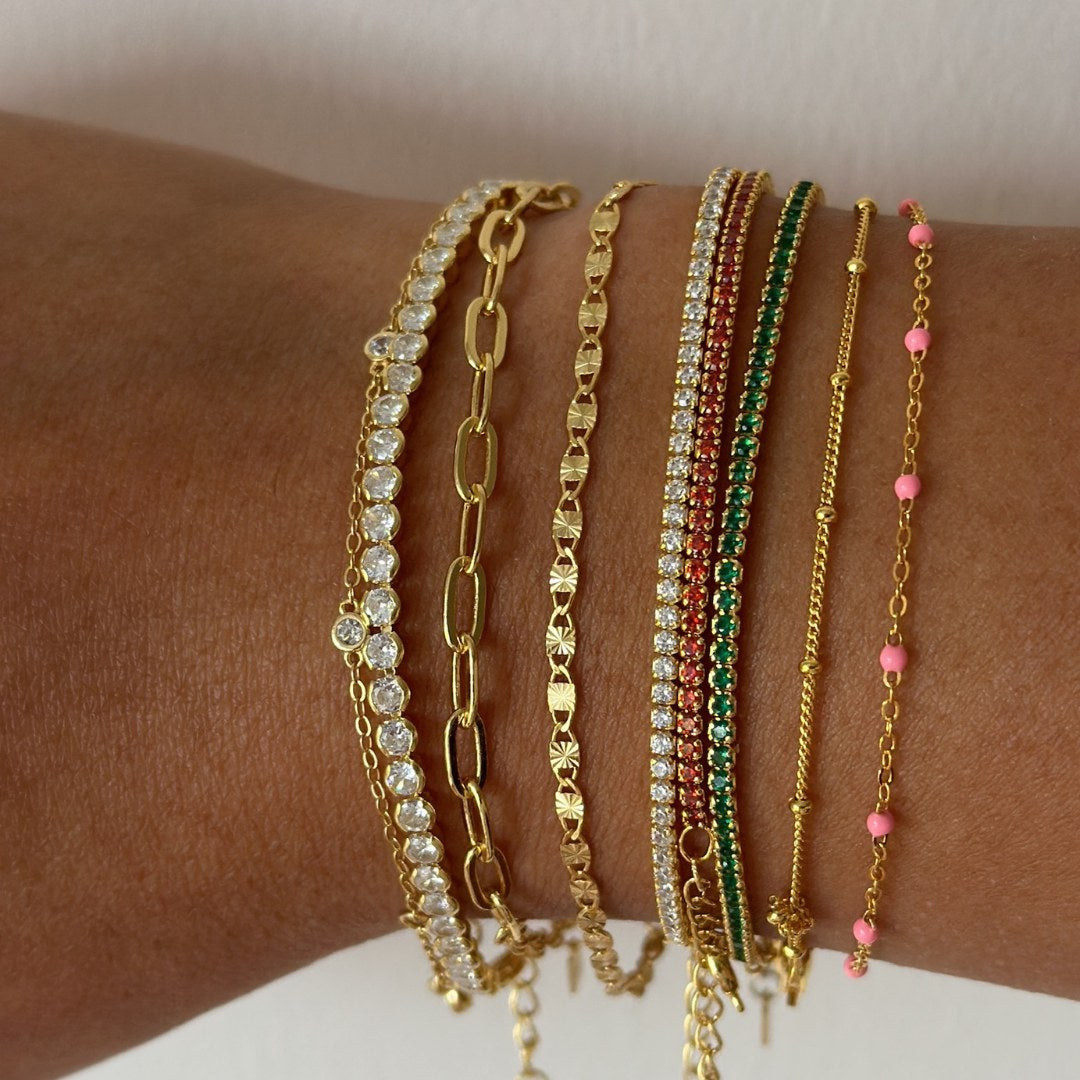 This Dainty Gold Red Tennis Bracelet by Nazzar is a captivating fusion of elegance and vibrancy. Each cubic zirconia stone is meticulously hand-set in a classic tennis bracelet design, exuding timeless sophistication with a modern twist. Perfect for a pop of color to your everyday look, this bracelet is made with a 100% recycled Sterling Silver base and a thick layer of high-quality 14k gold plating. It is also waterproof, tarnish-free, and hypoallergenic, ensuring lasting quality.