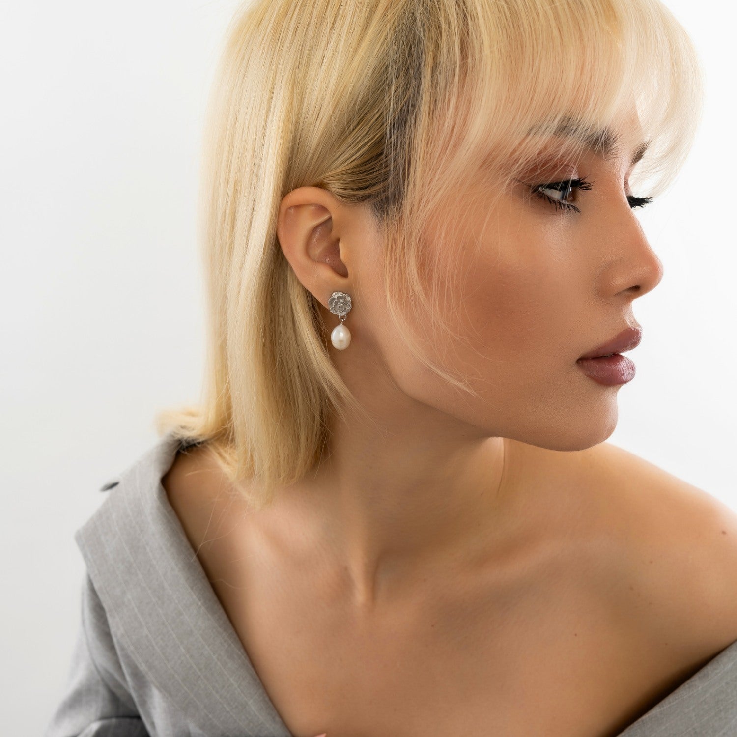 These Silver Rose Drop Earrings With Pearl by Mejoma are an elegant and sophisticated accessory that adds a touch of classic charm to any outfit. The delicate silver rose design is a beautiful complement to the lustrous pearl drop, creating a timeless and feminine aesthetic. Perfect for a special occasion or for adding a touch of refined grace to your everyday look, these earrings are a must-have for a sophisticated jewelry collection.