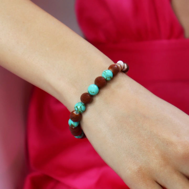 This bracelet is handcrafted with Turquoise stones, jasper stones, mother-of-pearl accents, and gold-plated brass components. It is a beaded bracelet.