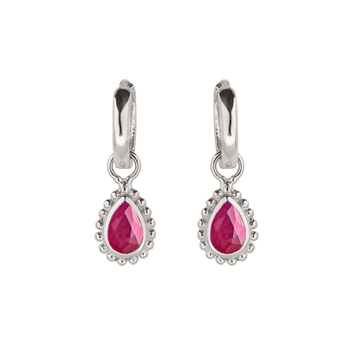 These July Birthstone Sterling Silver Huggie Hoops by Charlotte's Web Jewellery are a fiery and elegant accessory. The pear-shaped ruby stones are beautifully set in a sterling silver design, adding a bold yet sophisticated sparkle to your look. Ruby is associated with love, vitality, and protection, making these earrings a powerful and meaningful addition to your collection that tells a story of passion and strength.